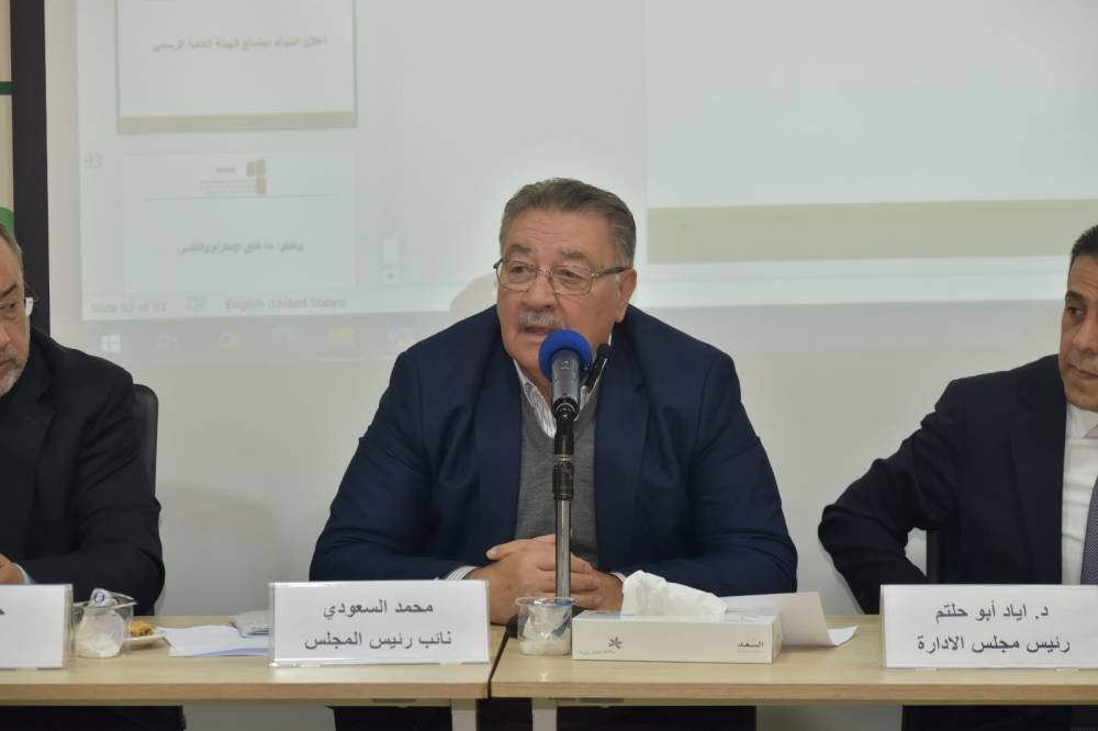 ومن جانبٍ آخر جرى مناقشة بنود جدول الأعمال الخاص بإجتماع الهيئة العامة العادي الثاني عشر والمصادقة على التقرير الاداري لمجلس الادارة عن أعمال الجمعية للعام 2022 والمصادقة على التقرير المالي وتقرير مدققي حسابات الجمعية لعام 2022 وابراء ذمة مجلس الادارة, كما تم الموافقة على إعادة تعيين مدققي حسابات شركة المراقبون المهنيون لتدقيق الحسابات المالية للسنة المالية 2023 وتفويض مجلس الإدارة بتحديد أتعابهم، بالاضافة الى موافقة الهيئة العامة على تعيين السيد يزن اشنانه عضوا في مجلس ادارة الجمعية.