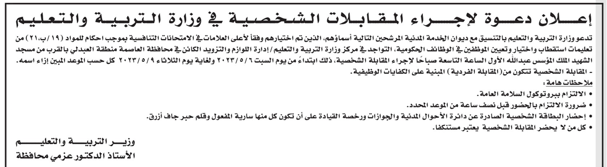 بالأسماء..التربية تدعو مرشحين لإجراء المقابلات الشخصية