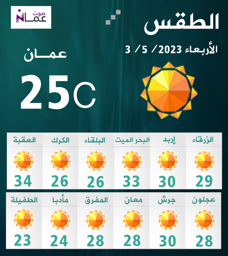 يطرأ ارتفاع طفيف على درجات الحرارة،اليوم الأربعاء، ويكون الطقس معتدل في أغلب المناطق، ودافئ في الأغوار والبحر الميت والعقبة، وتكون الرياح شمالية شرقية إلى شمالية غربية معتدلة السرعة تنشط أحيانا في مناطق البادية.