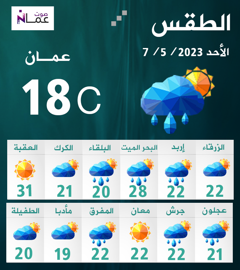تتأثر المملكة، اليوم الأحد، بكتلة هوائية رطبة ولطيفة الحرارة، حيث تسجل درجات الحرارة أقل من معدلاتها العامة بحوالي (5-6) درجات مئوية، وتكون الأجواء لطيفة في أغلب المناطق، ومعتدلة في الأغوار والبحر الميت والعقبة، مع ظهور كميات من الغيوم على ارتفاعات منخفضة خاصة في شمال ووسط المملكة والفرصة مهيأة في ساعات الصباح الباكر لسقوط زخات خفيفة من المطر في المناطق الشمالية، والرياح شمالية غربية معتدلة السرعة تنشط بين الحين والآخر تثير الغبار في مناطق البادية.