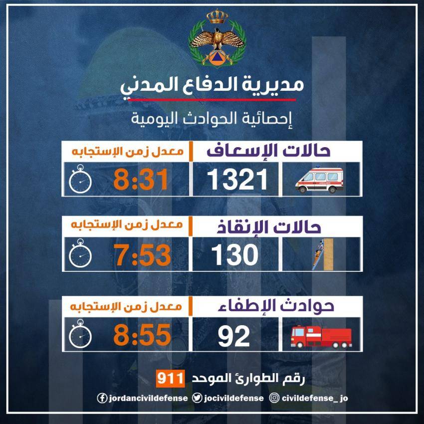 خلال الــ 24 ساعة الماضية تعاملت فرق الدفاع المدني مع (1321) حالة اسعافية مختلفة وبمعدل زمن الاستجابة (8:31) دقيقة، حيث تم إجراء اللازم لهم وتأمين وصولهم إلى المستشفيات.