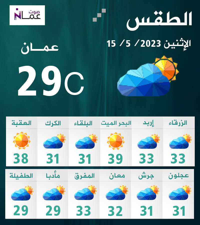 يوم غد الثلاثاء، يطرأ ارتفاع آخر على درجات الحرارة لتصبح الأجواء جافة وحارة نسبياً في أغلب المناطق، وحارة في مناطق البادية والأغوار والبحر الميت والعقبة، مع ظهور الغيوم على ارتفاعات عالية، وتكون الرياح شرقية معتدلة السرعة تنشط أحياناً مثيرة للغبار على فترات خاصة في مناطق البادية.