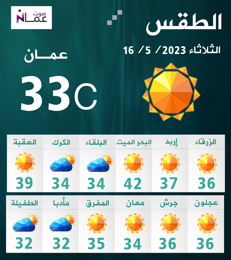 يطرأ ارتفاع قليل على درجات الحرارة، اليوم الثلاثاء، لتسجل أعلى من معدلاتها العامة لمثل هذا الوقت من السنة بنحو (4-5) درجات مئوية، مع بقاء الأجواء حارة نسبياً في أغلب المناطق، وحارة في البادية والأغوار والبحر الميت والعقبة، وتكون الرياح شرقية معتدلة السرعة تنشط أحياناً.