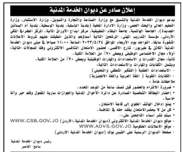 دعا ديوان الخدمة المدنية اليوم الثلاثاء بالتنسيق مع عدد من الوزارات والمؤسسات الرسمية، عدداً من المرشحين لحضور الامتحان التنافسي وإجراء المقابلات الشخصية.