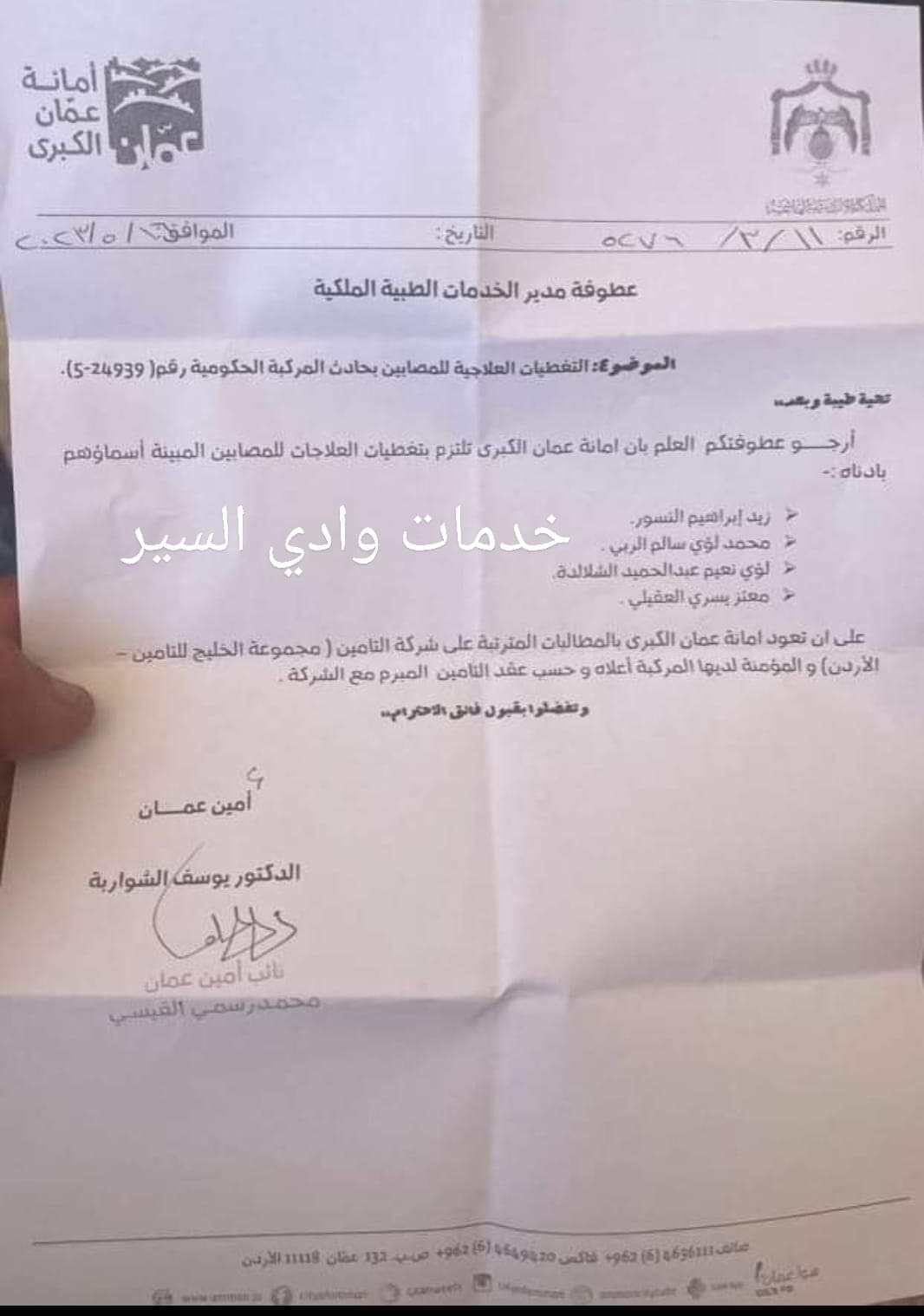 وأصدرت الأمانة بيان موجه إلى مدير الخدمات الطبية الملكية تعُلن به عن تغطيها لعلاج المصابين بحادث المركبة الحكومية مما اسرفت على وفاة شخصان وأصيب 6 آخرين مساء الخميس الماضي.
