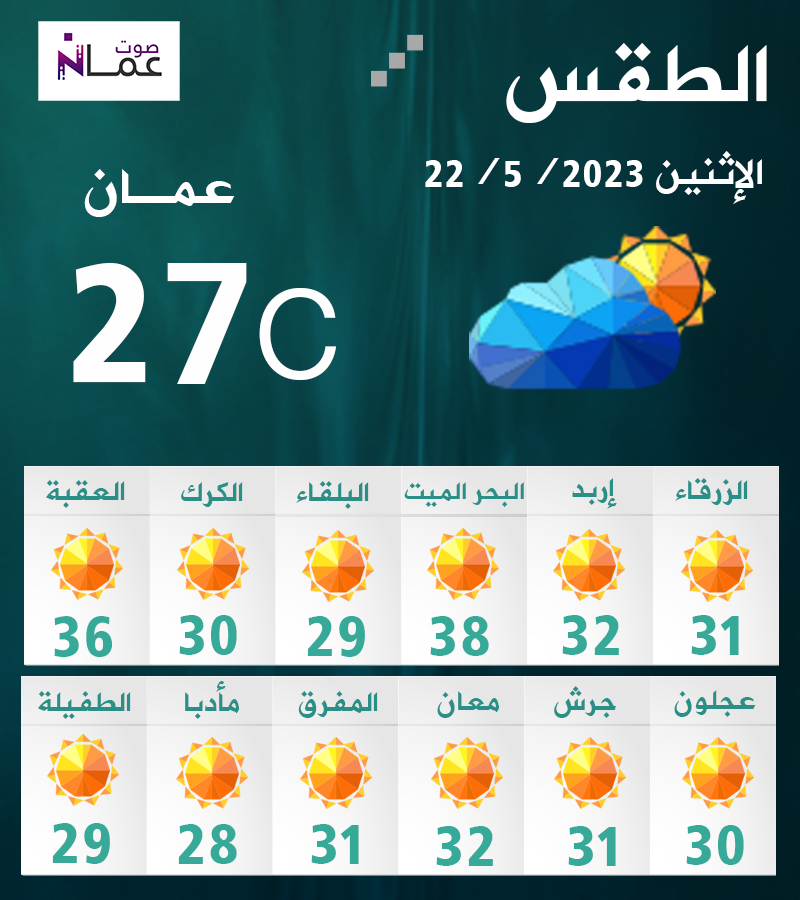 تتأثر المملكة، اليوم الإثنين، بمنخفض جوي خماسيني، حيث يطرأ ارتفاع ملموس على درجات الحرارة؛ وتسود أجواء جافة ومغبرة وحارة نسبياً في أغلب المناطق، وحارة في الأغوار والبحر الميت والعقبة، مع ظهور الغيوم على ارتفاعات متوسطة وعالية، والرياح جنوبية غربية نشطة السرعة مع هبات قوية أحياناً تصل سرعتها إلى 50 كم/ساعة.