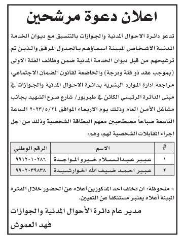 أعلن عدد من الوزارات والبلديات والمؤسسات الحكومية اليوم الاثنين بالتنسيق مع ديوان الخدمة المدنية، عن حاجتهم لتعبئة وظائف شاغرة، كما دعت عددا من المرشحين لإجراء المقابلات الشخصية.