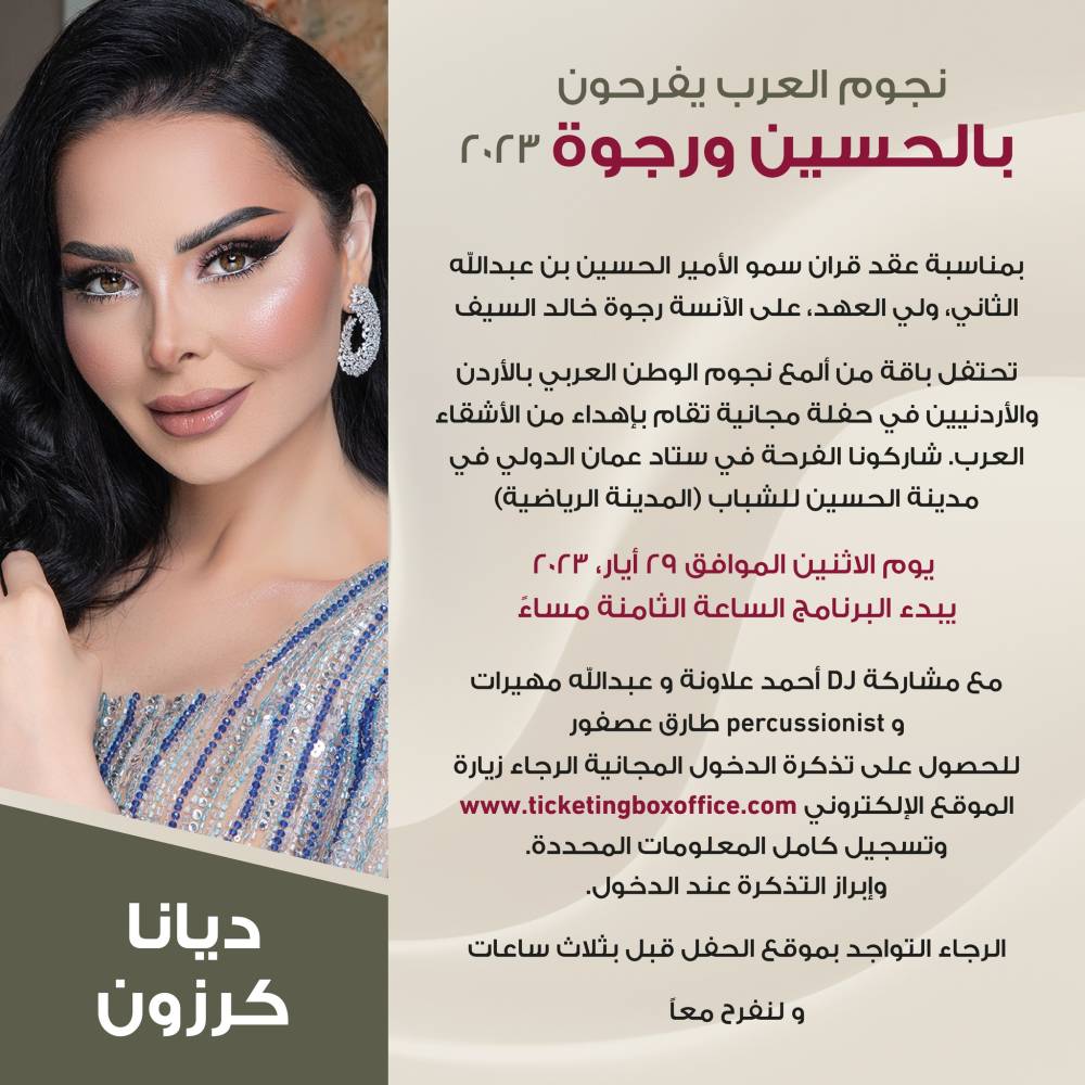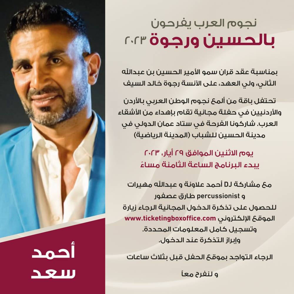 بمناسبة عقد قران سمو الأمير الحسين بن عبدالله الثاني، ولي العهد، على الآنسة رجوة خالد السيف نخبة من نجوم الغناء العربي تشارك الشعب الأردني أفراحه المديدة بعقد قران سمو ولي العهد، أميرنا المحبوب، الحسين بن عبدالله الثاني على الآنسة رجوة خالد السيف، عبر إهدائهم ومشاركتهم في حفل جماهيري كبير يحتضنه استاد عمان الدولي في المدينة الرياضية. شاركونا "نفرح بالحسين".