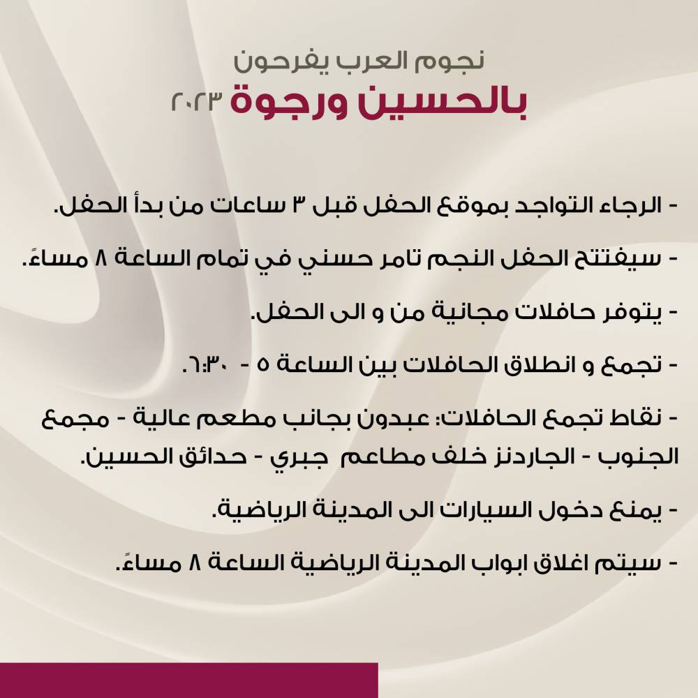 ويبدأ الحفل في الساعة 8 من مساء 29 أيار، حيث ستغلق الأبواب مع بدء الحفلة، وفقا لما نشرت الصفحة، مطالبة المسجلين بالحضور إلى الموقع قبيل بدء الحفل بـ 3 ساعات؛ حيث سيمنع دخول المركبات إلى المدينة الرياضية.