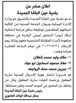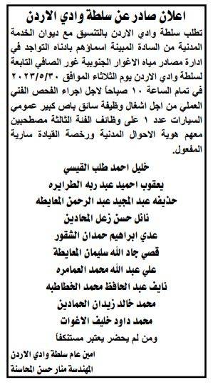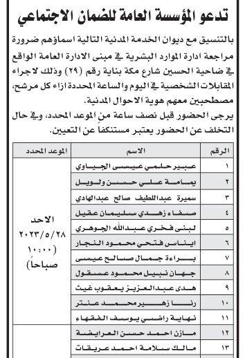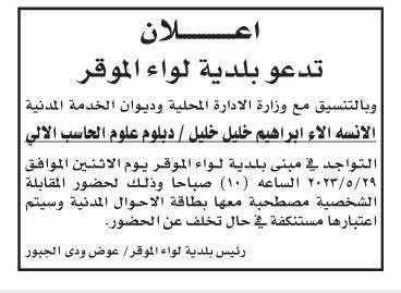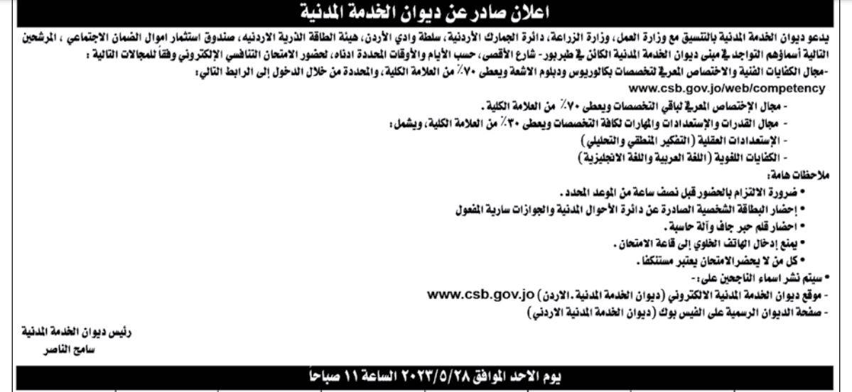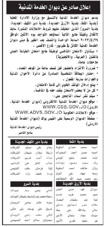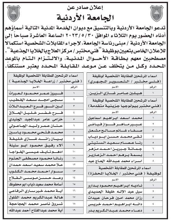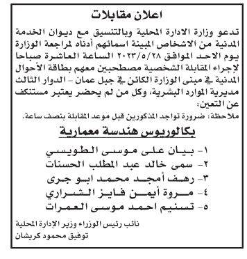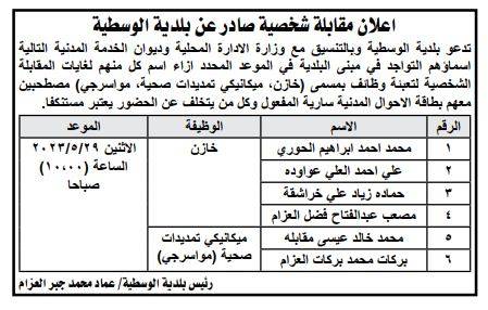 دعت عددا من الوزارات والمؤسسات الرسمية والبلديات بالتنسيق مع ديوان الخدمة المدنية اليوم الأربعاء، مرشحين لإجراء المقابلات الشخصية واستكمال إجراءات التعيين.