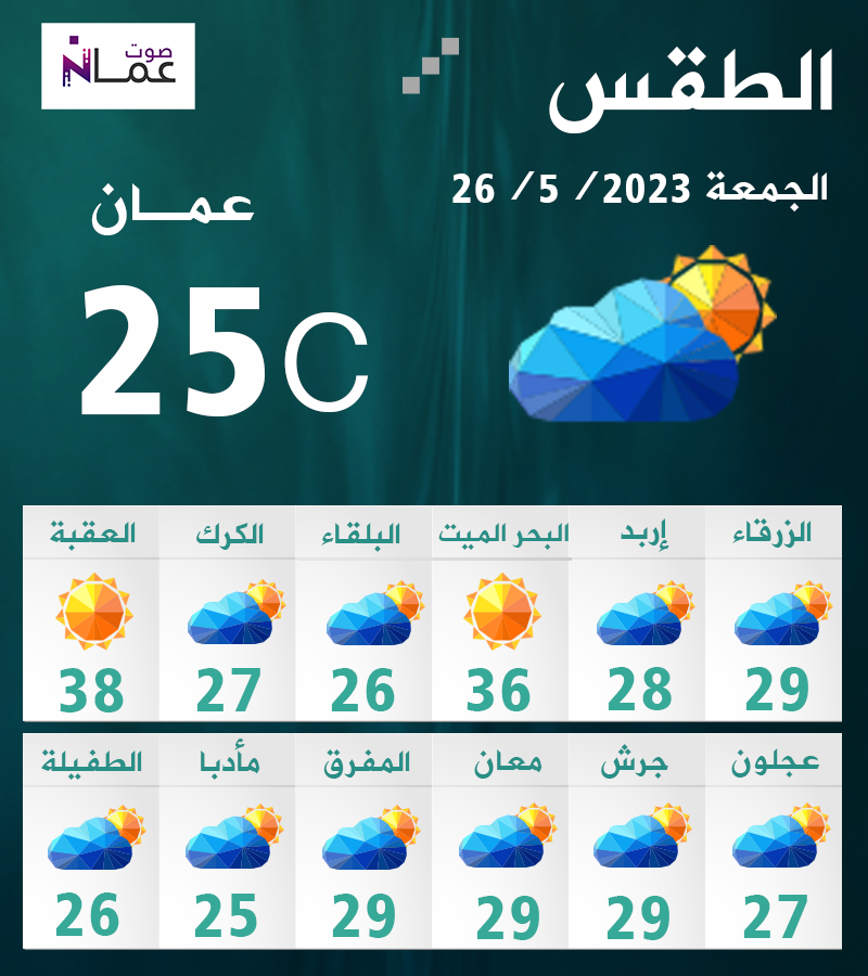 يطرأ انخفاض طفيف على درجات الحرارة، اليوم الجمعة،ويكون الطقس، معتدل الحرارة في أغلب المناطق، وحار نسبياً في الأغوار والبحر الميت والعقبة، مع ظهور بعض من الغيوم على ارتفاعات متوسطة وعالية، وتكون الرياح شمالية غربية معتدلة السرعة تنشط بين الحين والآخر وتؤدي إلى إثارة غبار خفيف خاصة في المناطق الصحراوية.