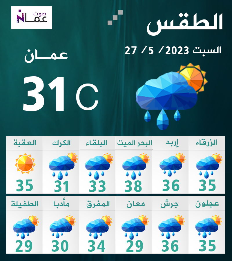 ويتعمق تأثير حالة عدم الاستقرار الجوي يوم غدٍ الأحد، وتنخفض درجات الحرارة وتكون الأجواء مغبرة بوجه عام ومعتدلة الحرارة في المناطق الجبلية والسهول وحارة نسبياً إلى حارة في باقي المناطق، مع ظهور كميات من الغيوم على ارتفاعات مختلفة، وتسقط زخات متفرقة من المطر في مناطق مختلفة من المملكة ولاسيما المناطق الجنوبية والجنوبية الشرقية بما فيها مدينة العقبة قد تكون غزيرة أحيانا ومصحوبة بالرعد وتساقط حبات من البرد، ما يؤدي إلى تشكل السيول في الأودية والمناطق المنخفضة، وتكون الرياح جنوبية شرقية إلى جنوبية غربية نشطة السرعة مع هبات قوية أحياناً تتجاوز سرعتها 70كم/س في بعض المناطق.