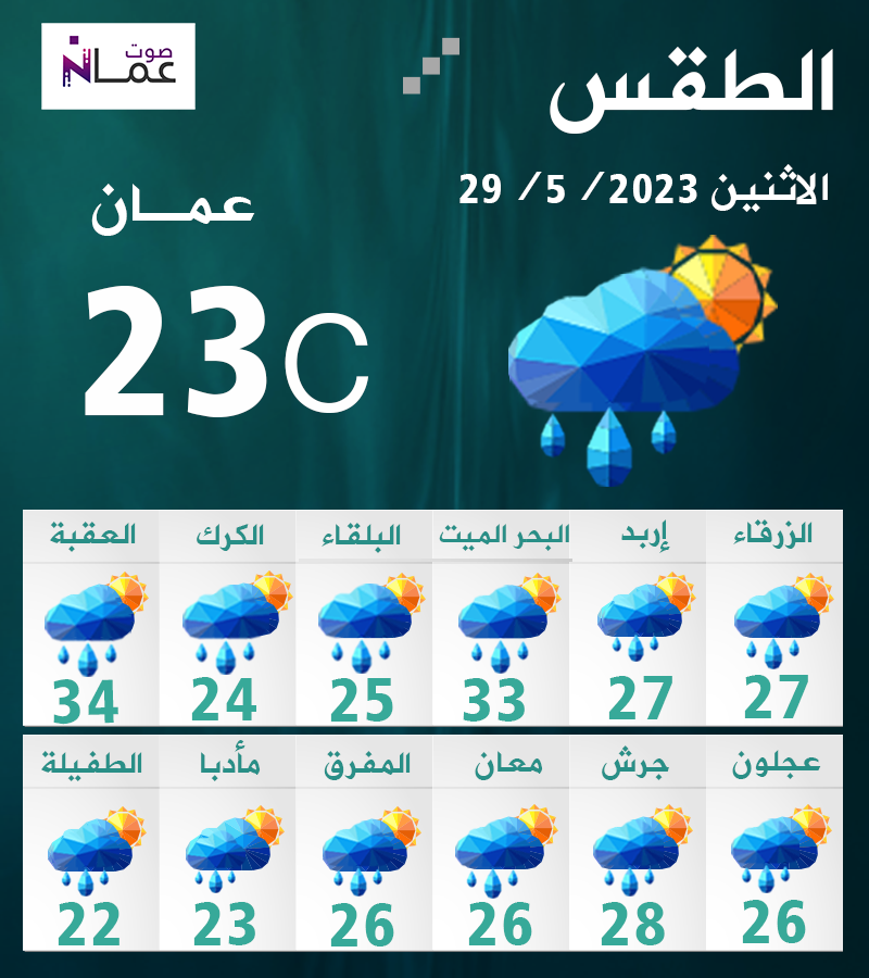 تبقى المملكة اليوم الاثنين، تحت تأثير حالة من عدم الاستقرار الجوي، وتكون الأجواء معتدلة الحرارة في معظم المناطق وحارة نسبياً في الأغوار والبحر الميت والعقبة، مع ظهور كميات من الغيوم على ارتفاعات مختلفة.