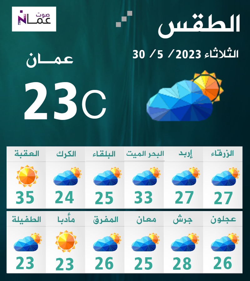 تصبح الأجواء، اليوم الثلاثاء معتدلة الحرارة في أغلب مناطق المملكة، وحارة نسبياً في الأغوار والبحر الميت والعقبة، مع ظهور الغيوم على ارتفاعات مختلفة.