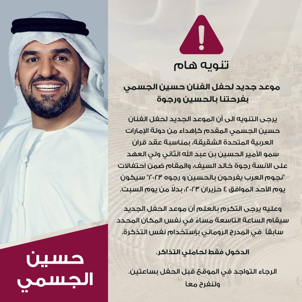 بعد الإعلان عن حفل الفنان حسين الجسمي الذي كان مقررا أن يكون يوم السبت المقبل في المدرج الروماني بوسط العاصمة عمان، تقرر تأجيل الحفل إلى يوم الأحد المقبل الموافق 4 حزيران في تمام الساعة التاسعة مساء.