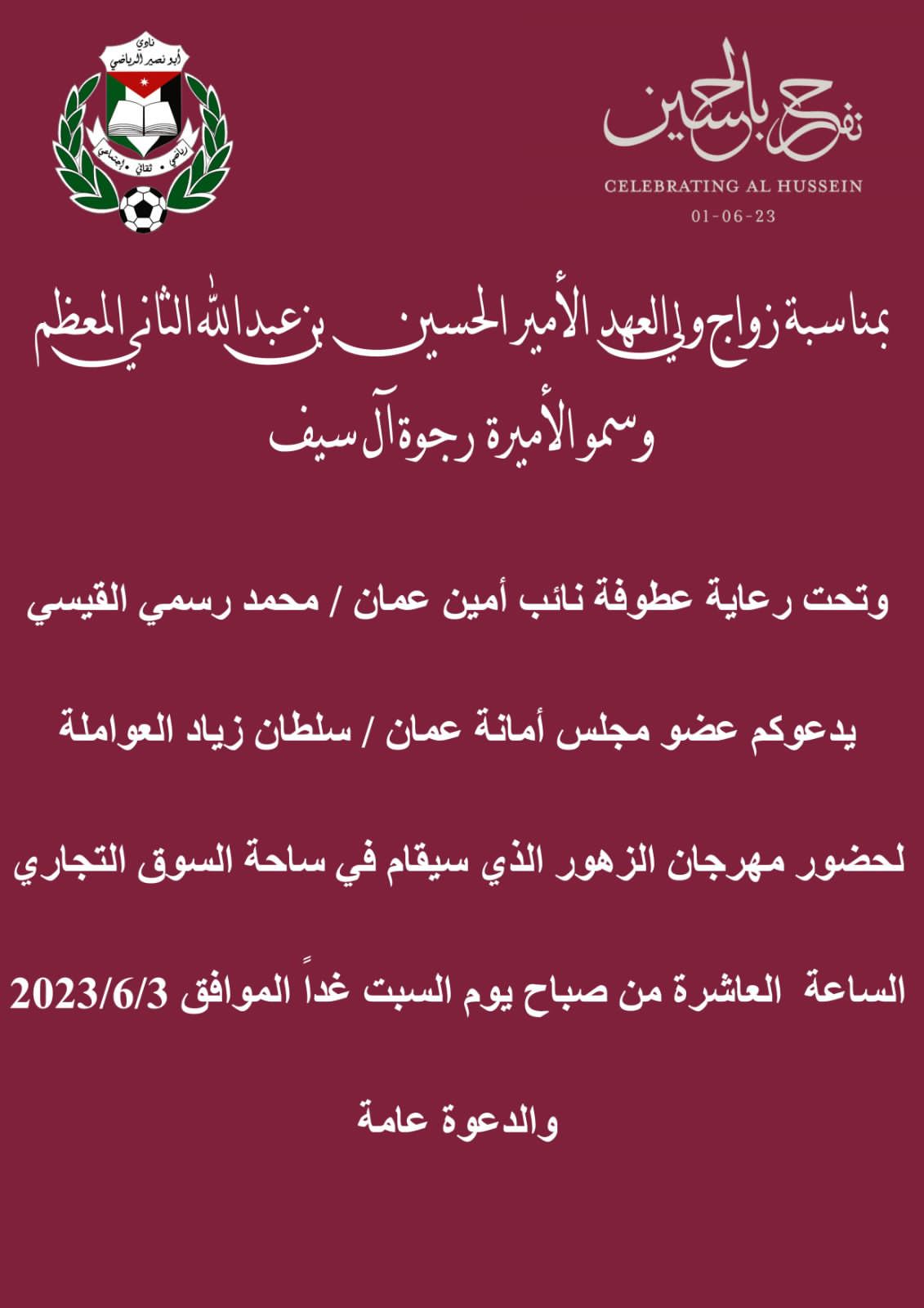 بمناسبة زواج ولي العهد الأمير الحسين بن عبد الله الثاني المعظم وسمو الأميرة رجوة آل سيف، وتحت رعاية عطوفة نائب أمين عمان محمد رسمي القيسي.