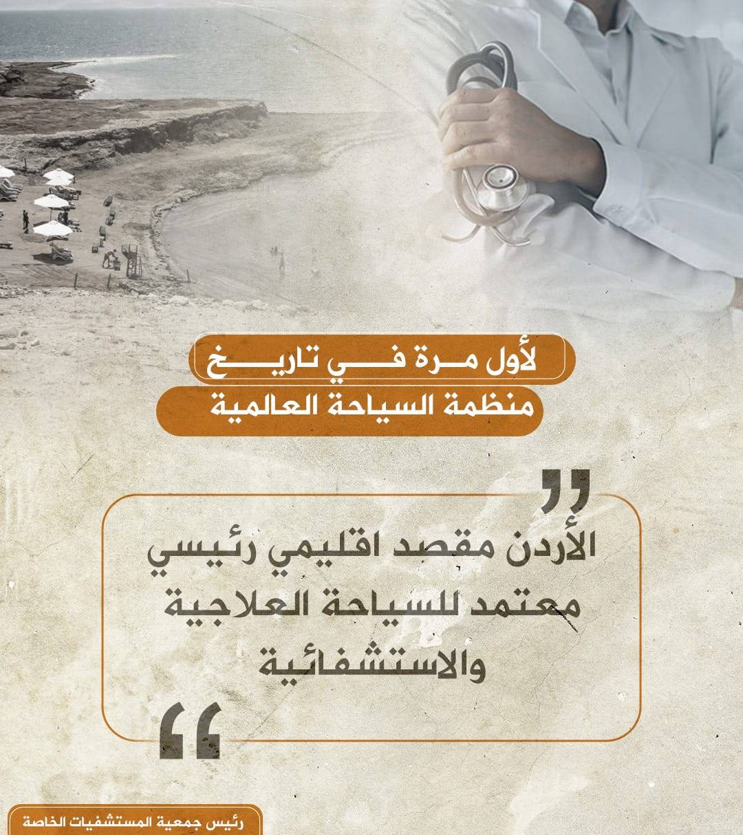 وأضاف الحموري، أنه "سيكون لأول مرة في تاريخ المنظمة أن تعلن عن دولة بأنها مقصد رئيسي معتمد للسياحة العلاجية والاستشفائية".