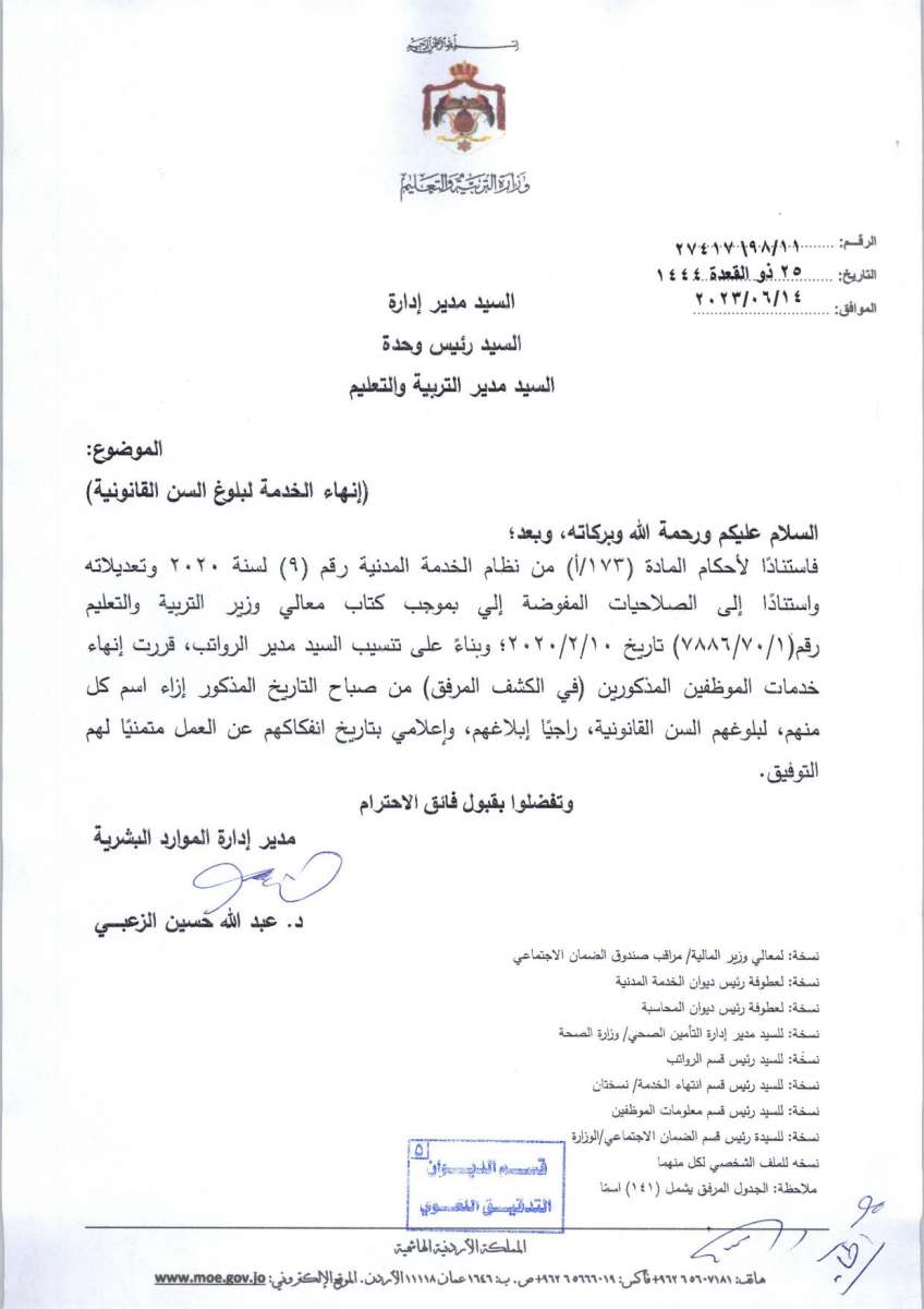 أصدرت وزارة التربية والتعليم قائمة احالات إلى التقاعد شملت 141موظفا.