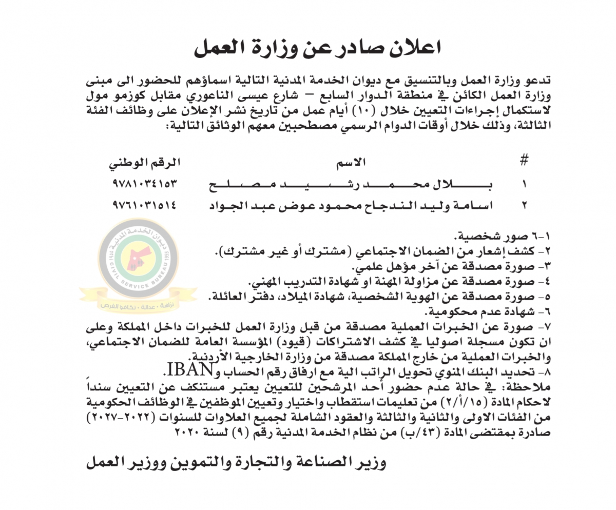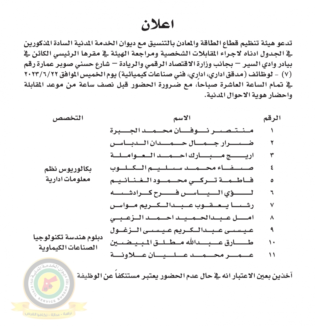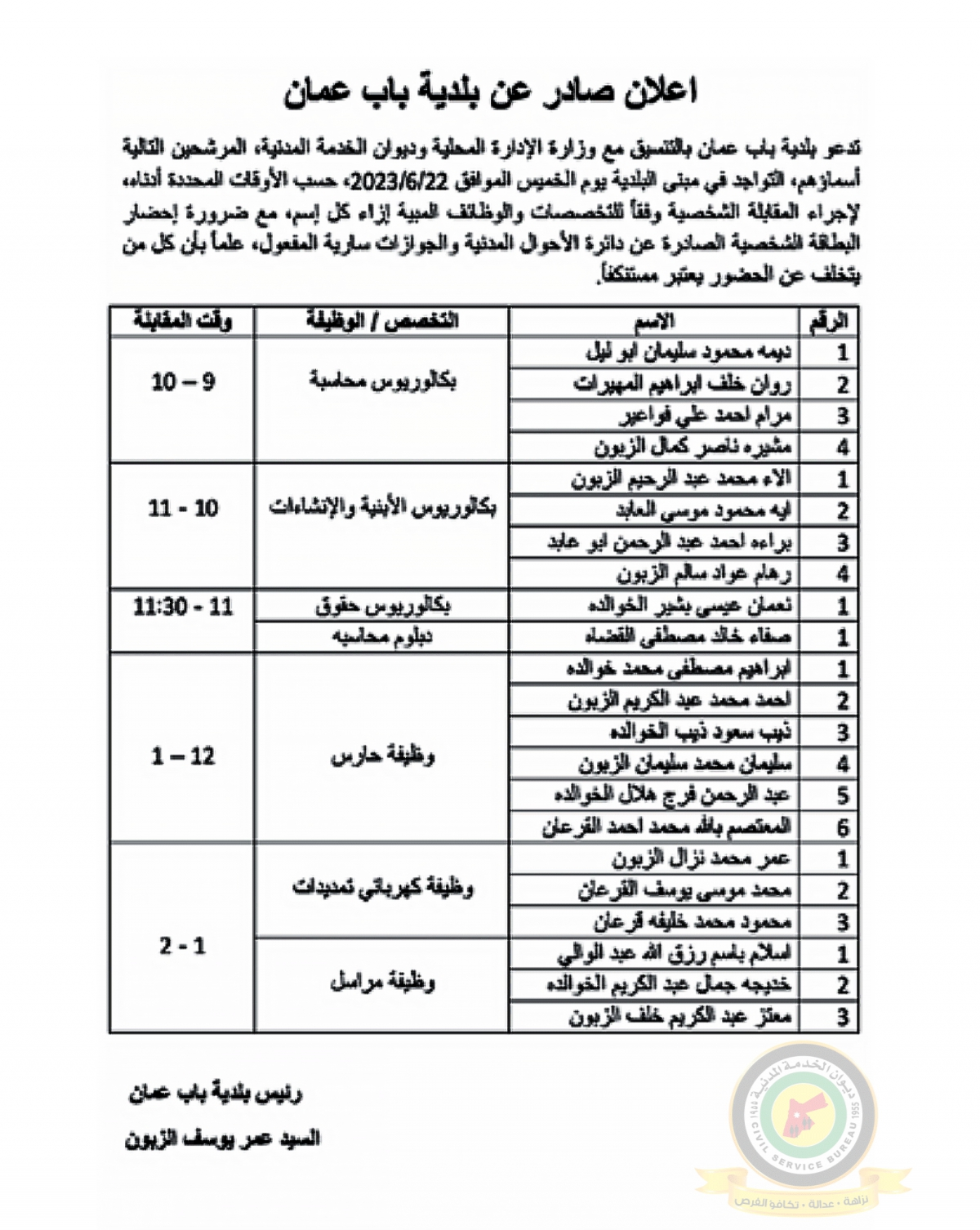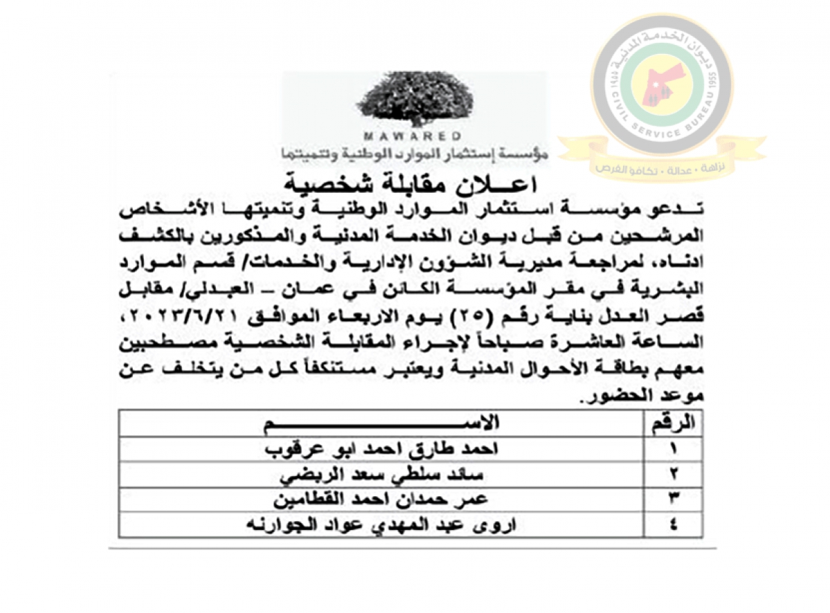 وجه ديوان الخدمة المدنية، دعوة للعديد من المواطنين، وذلك لإجراء المقابلات الشخصية وعقد الامتحان التنافسي لغايات التعيين، بالتعاون مع مختلف الوزارات والمؤسسات الحكومية.