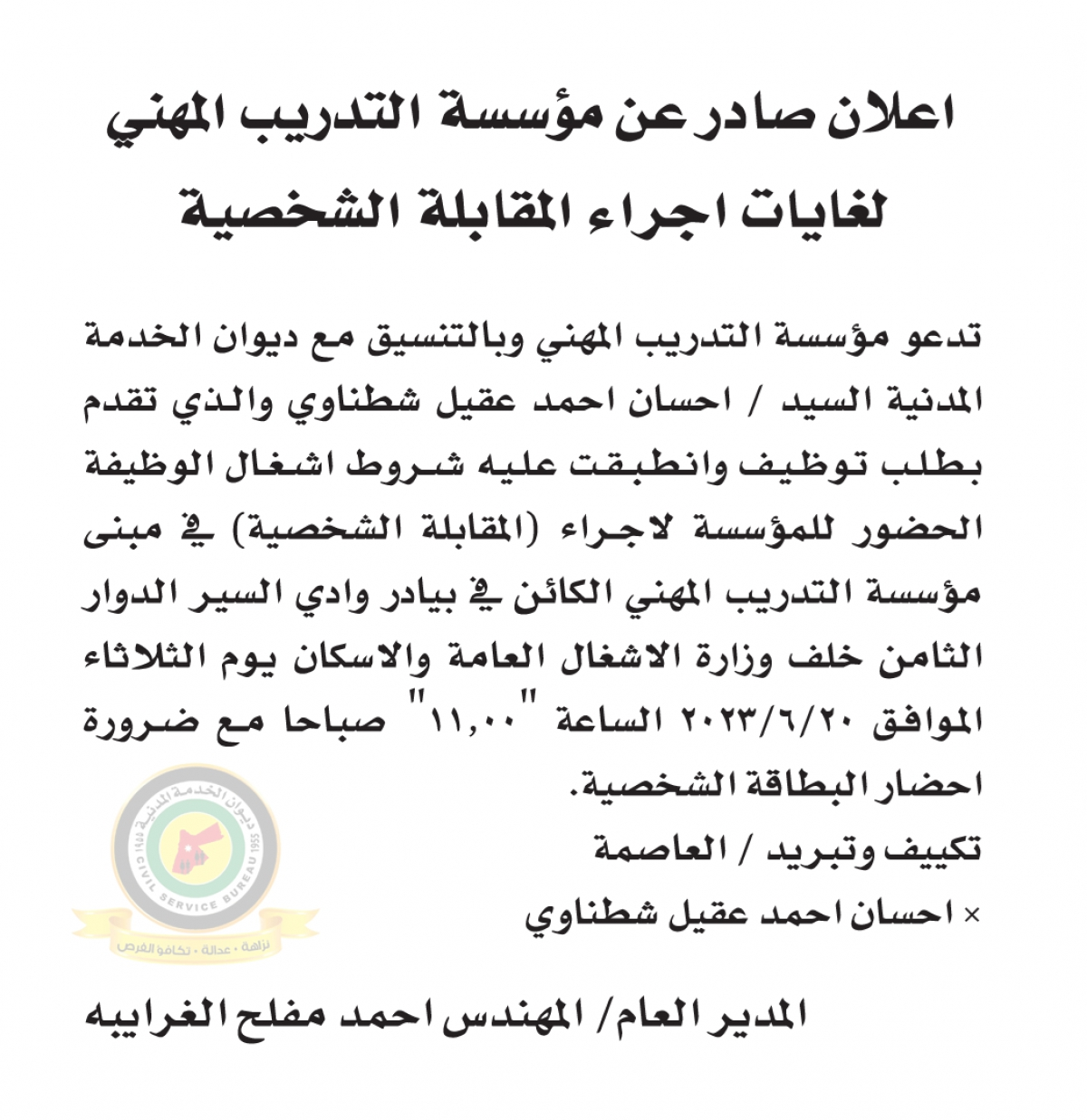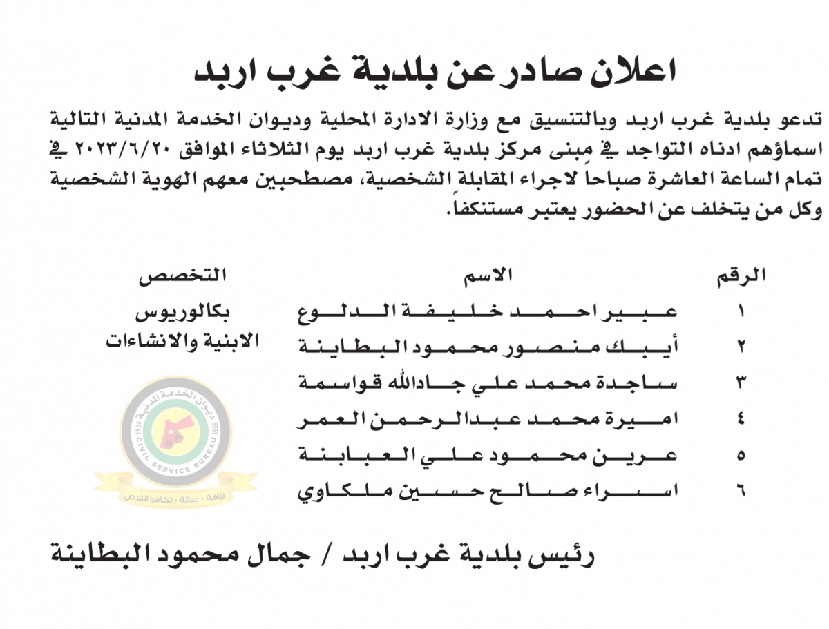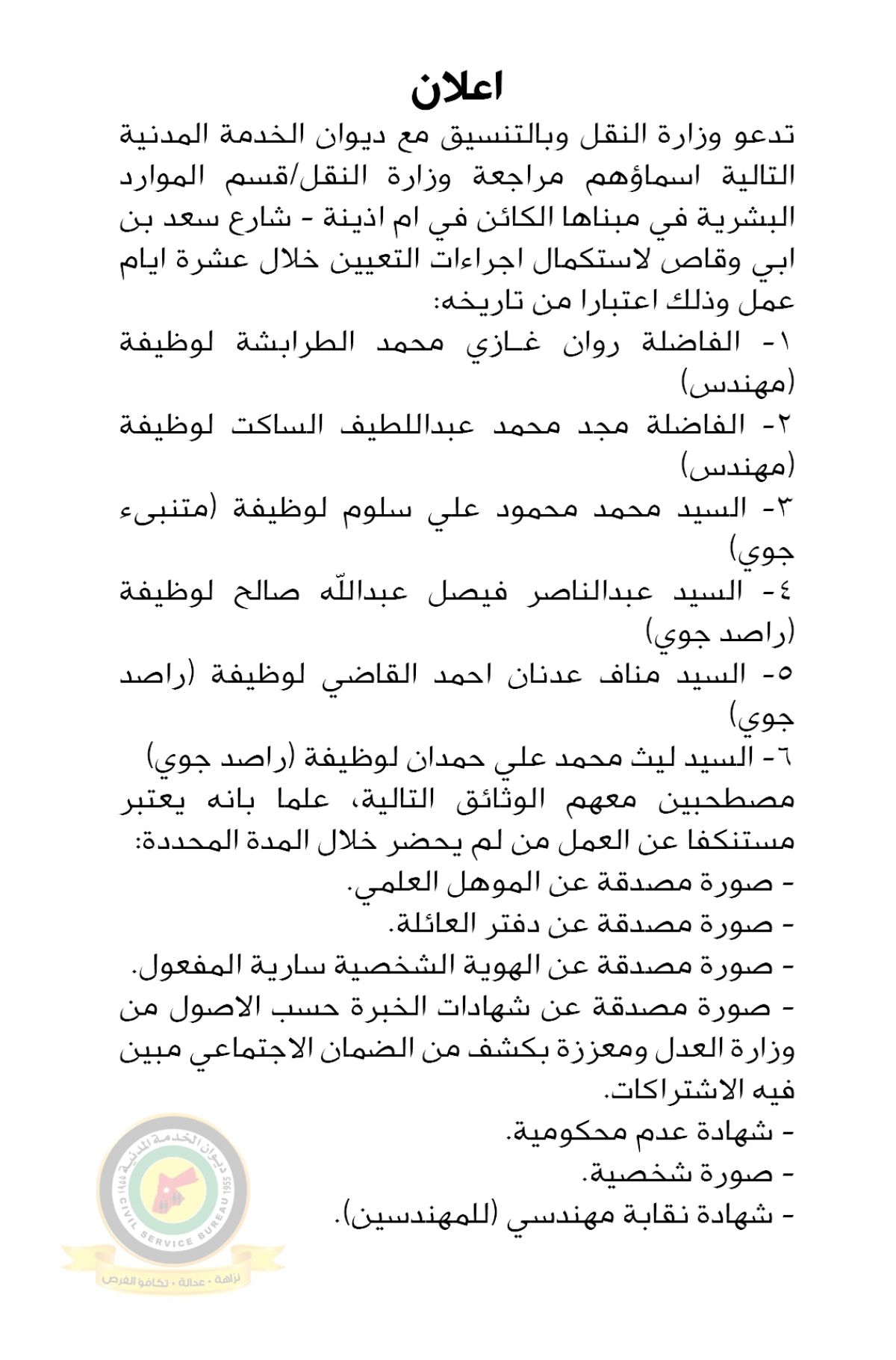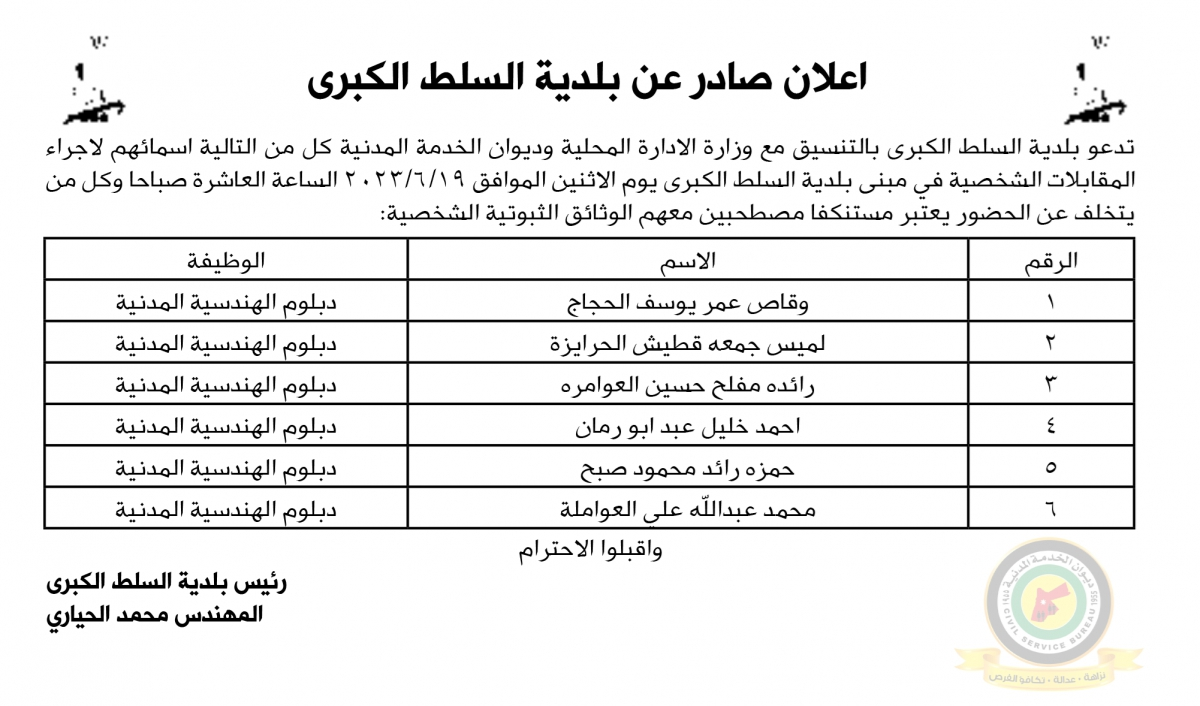 وجه ديوان الخدمة المدنية، دعوة للعديد من المواطنين، وذلك لإجراء المقابلات الشخصية وعقد الامتحان التنافسي لغايات التعيين، بالتعاون مع مختلف الوزارات والمؤسسات الحكومية.