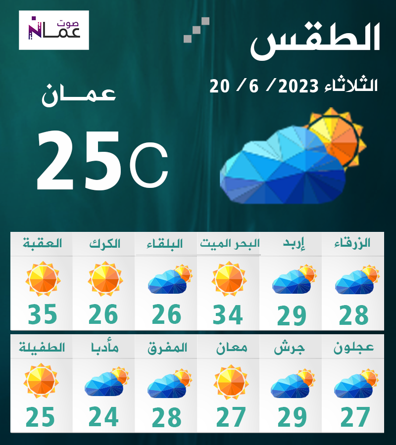 تبقى الأجواء، نهار يوم الثلاثاء، معتدلة الحرارة في أغلب المناطق، وحارة نسبياً في الأغوار والبحر الميت والعقبة، مع ظهور الغيوم على ارتفاعات منخفضة في شمال ووسط المملكة، والرياح شمالية غربية معتدلة السرعة تنشط أحياناً في مناطق البادية.