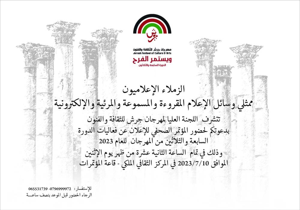 يعقد مهرجان جرش للثقافة والفنون يوم الإثنين المقبل عند مؤتمرا صحافيا في المركز الثقافي الملكي للإعلان عن فعاليات الدورة السابعة والثلاثين للمهرجان.