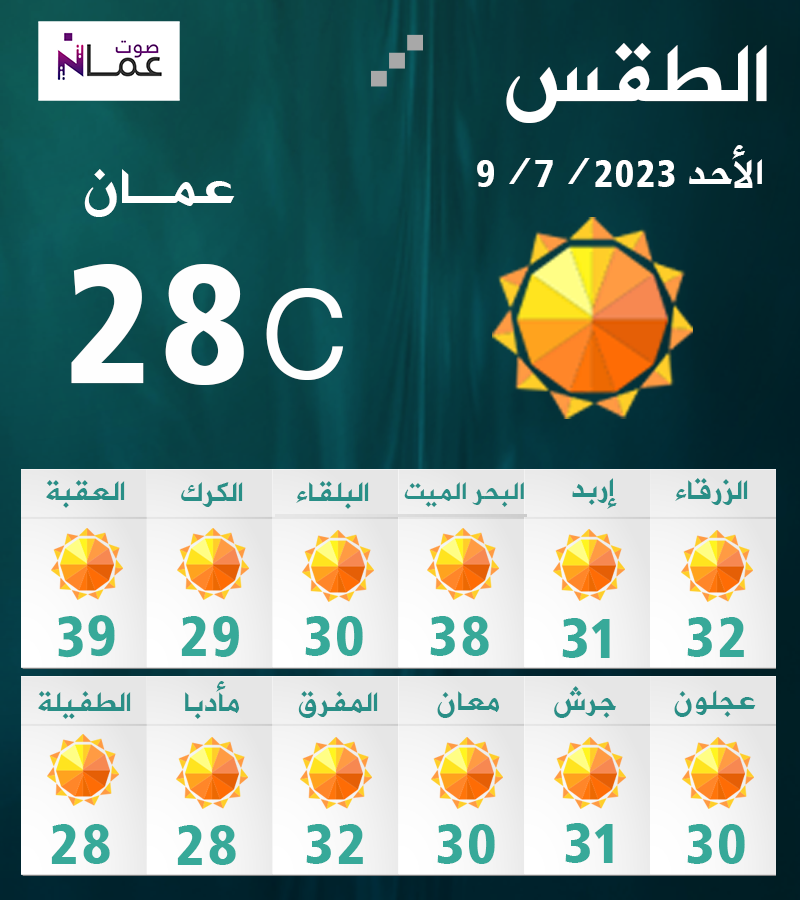 تبقى الأجواء صيفية عادية فوق المرتفعات الجبلية والسهول، نهار اليوم الأحد، وحارة في البادية والأغوار والبحر الميت والعقبة مع ظهور بعض الغيوم على ارتفاعات منخفضة في ساعات الصباح الباكر في شمال ووسط المملكة، والرياح شمالية غربية معتدلة السرعة تنشط احياناً.