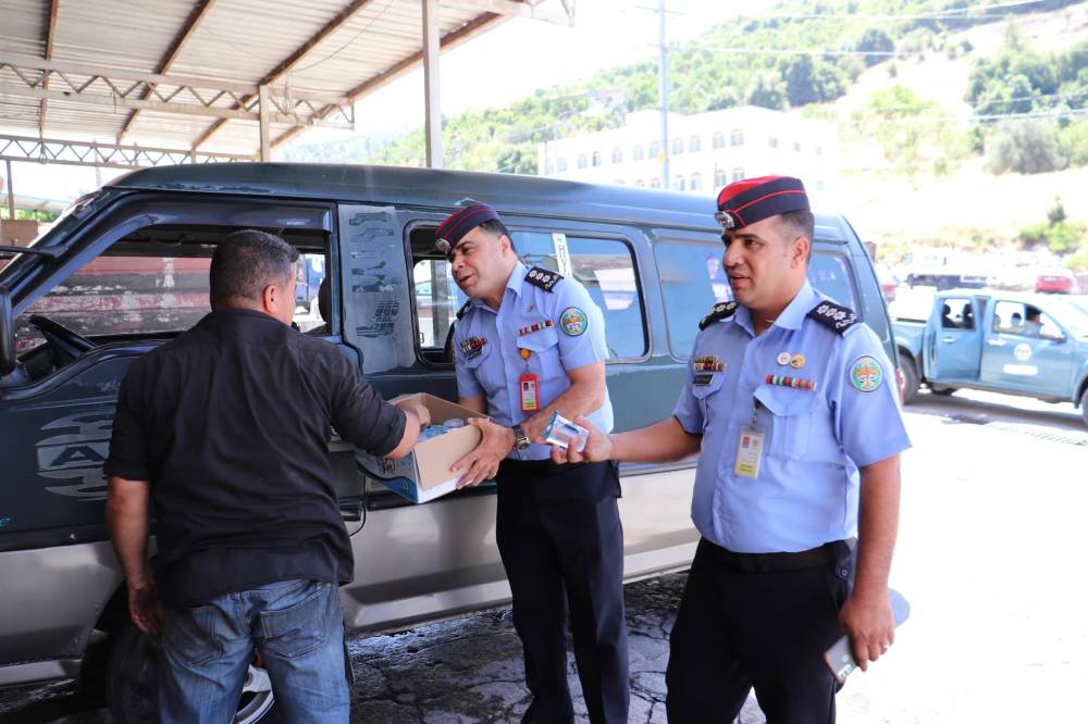 وقامت مرتبات مديرية الأمن العام ، بتوزيع المياه على مستخدمي الطرق الداخلية والخارجية، وعلى المارين والعمال والمتواجدين في التجمعات ومناطق العمل لا سيما مع ارتفاع درجات الحرارة في أوقات الظهيرة.