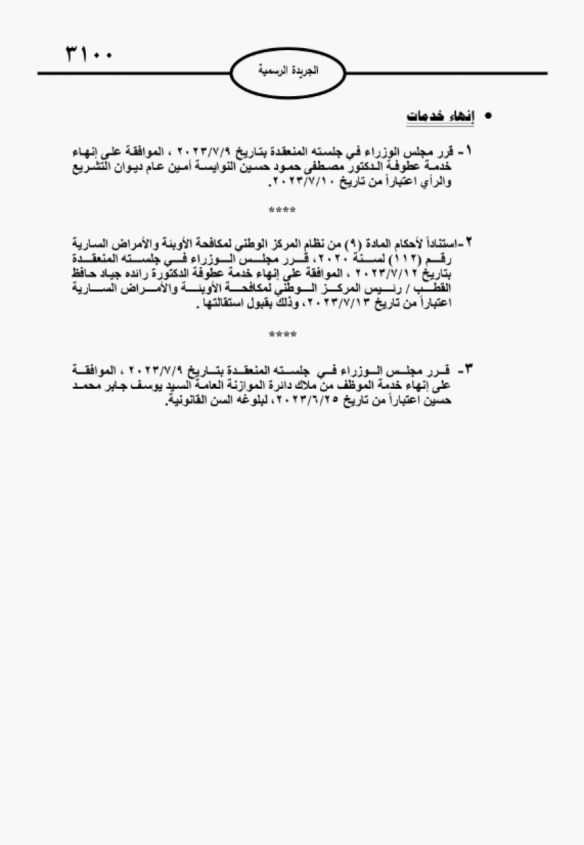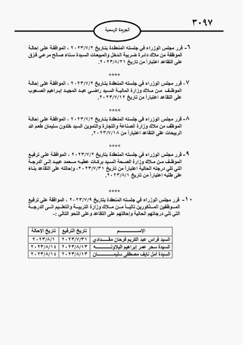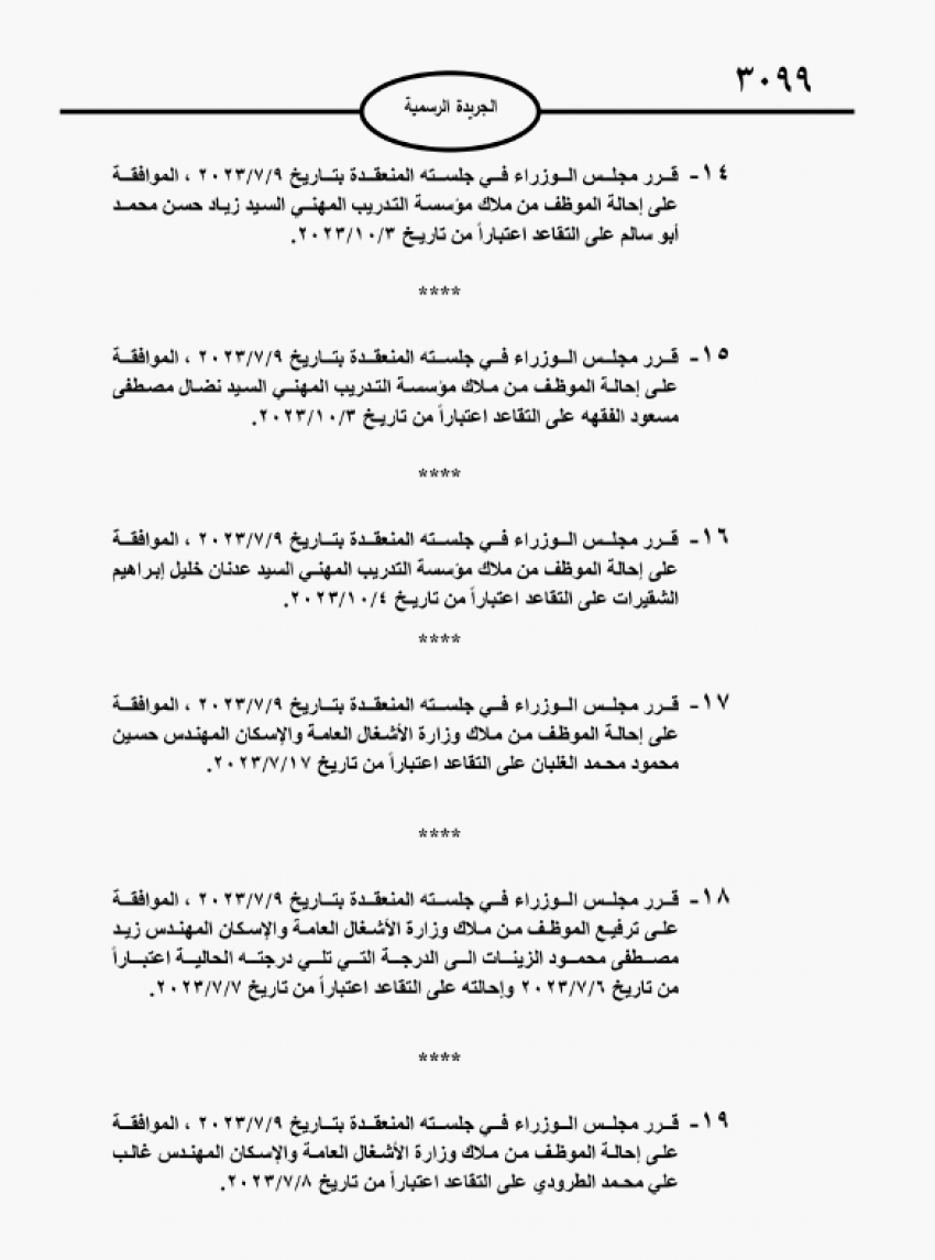 صدر في عدد الجريدة الرسمية، اليوم الأحد، قرارات مجلس الوزراء بإحالة عدد من موظفي الدولة إلى التقاعد، وانهاء خدمات اخرين.