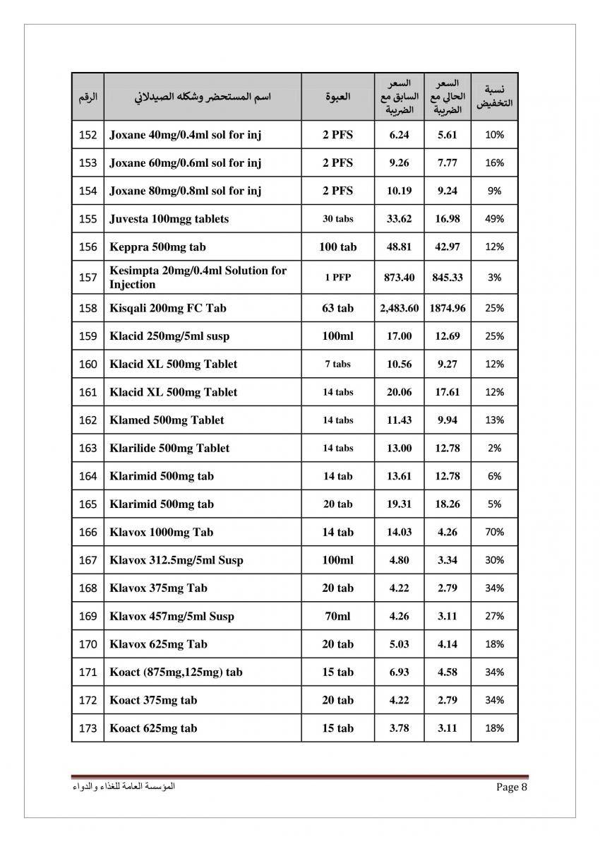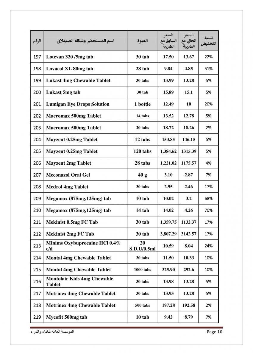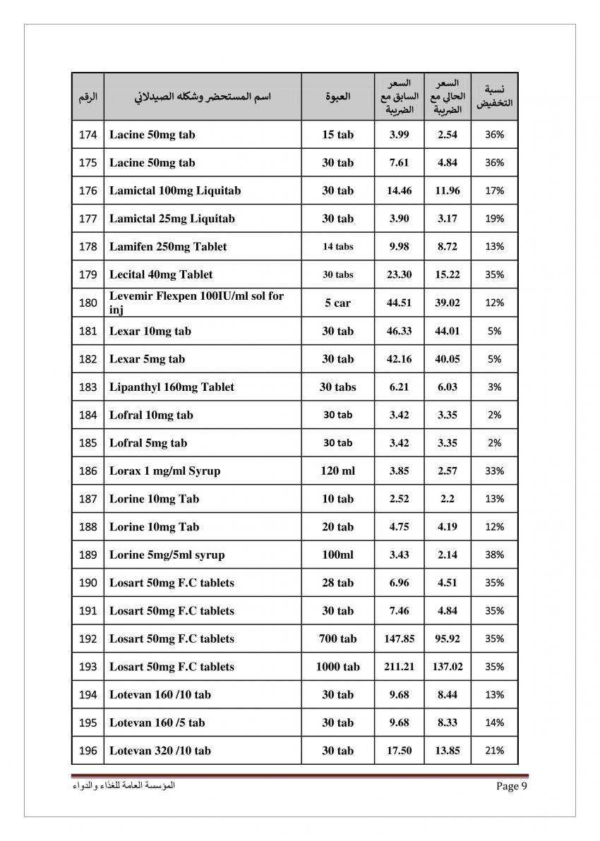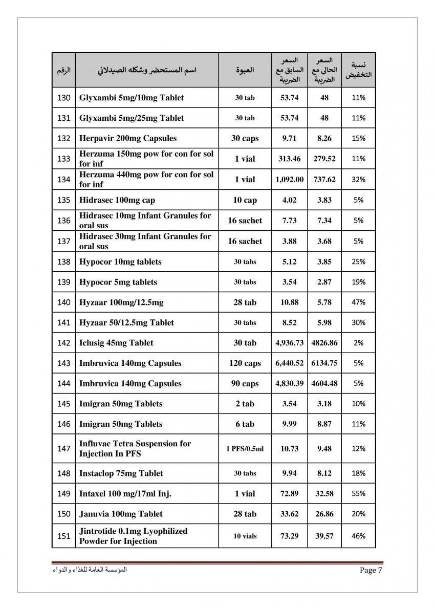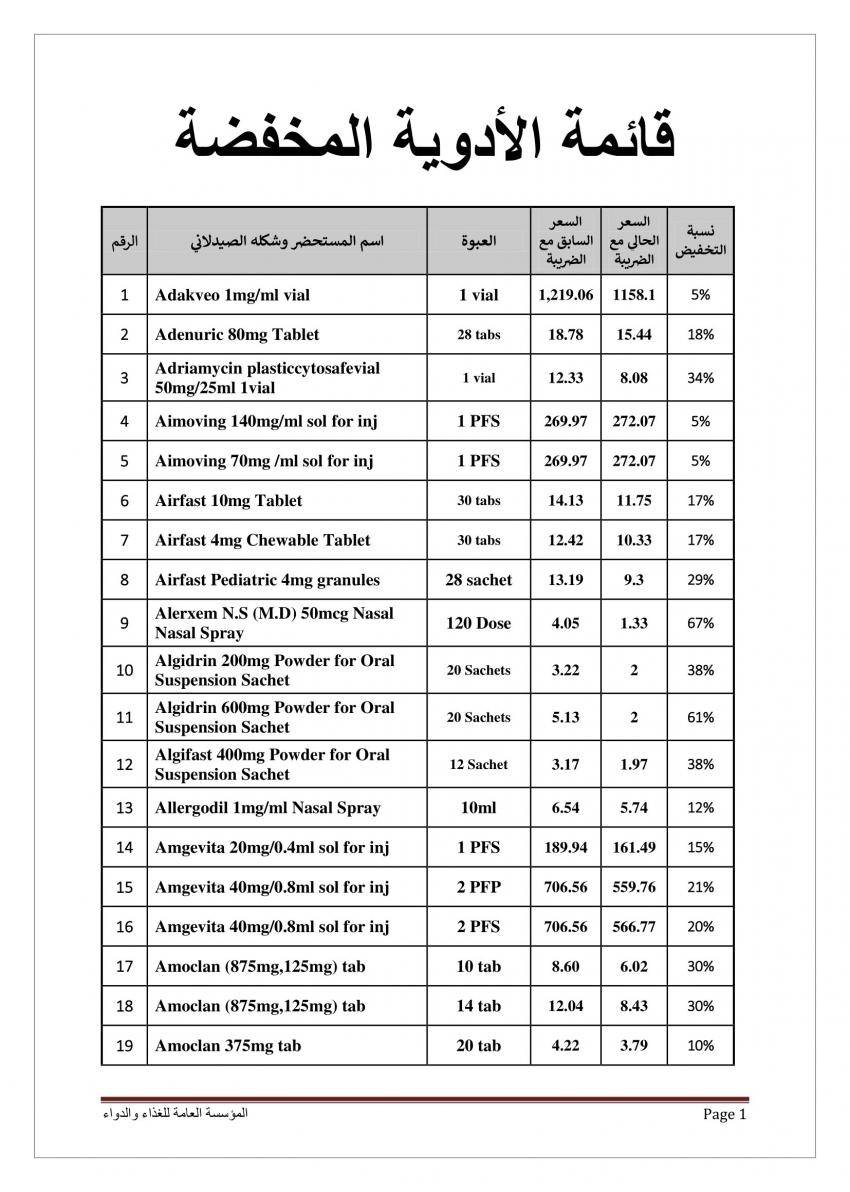 وكان مدير عام المؤسسة الأستاذ الدكتور نزار محمود مهيدات قد أعلن مؤخرا عن قرار تخفيض سعر عدة أصناف دوائية من الأدوية شائعة الاستخدام بنسب متفاوتة خلال النصف الأول من العام الحالي ، مشيرا إلى أن الأسعار الجديدة بوشر تطبيقها حاليا على بعض الأدوية على رفوف الصيدليات وسيطبق خلال الأشهر القادمة عند استيراد هذه الأدوية.