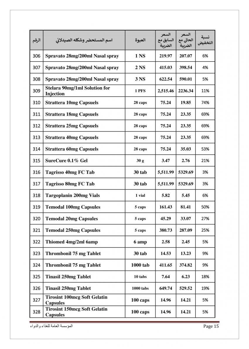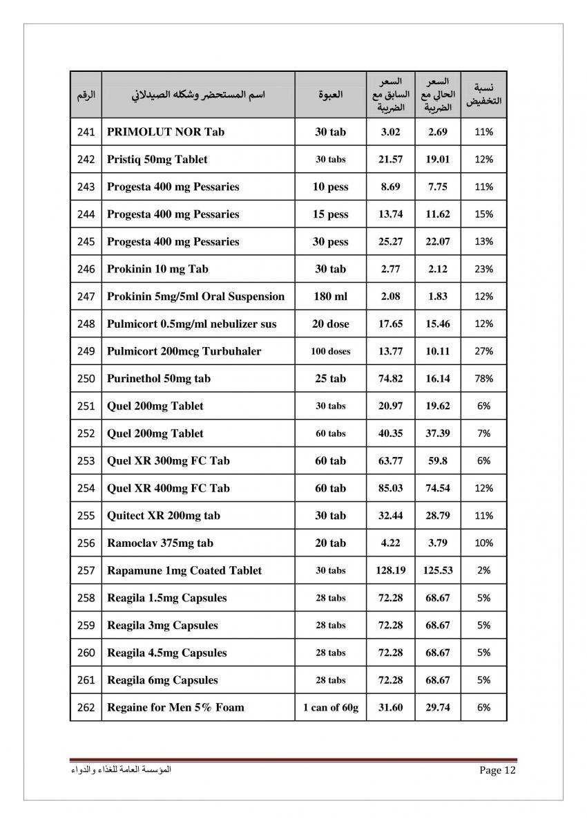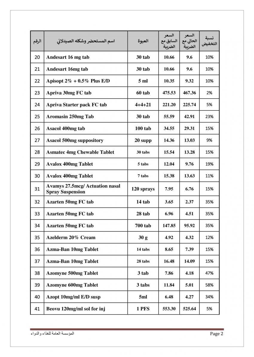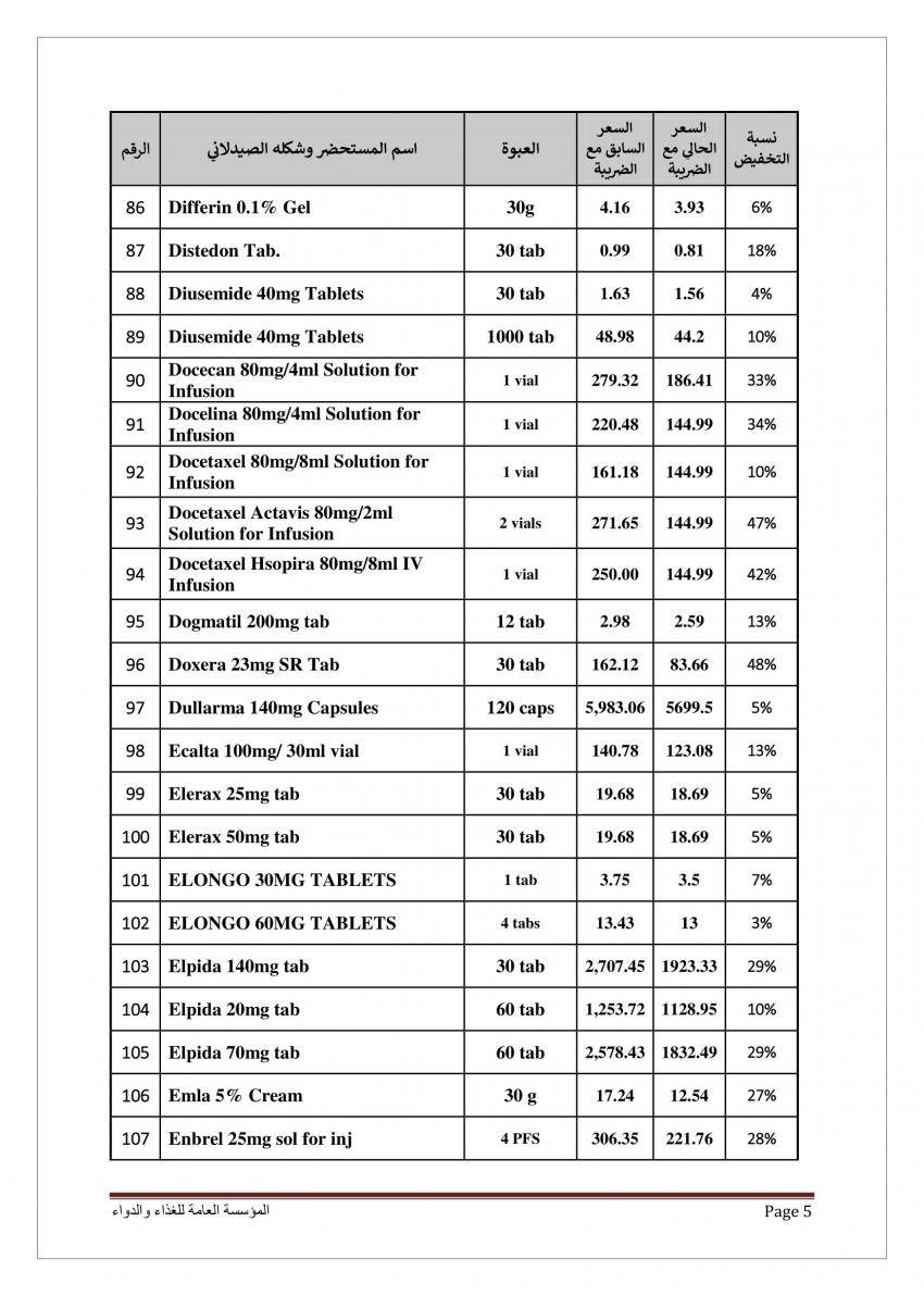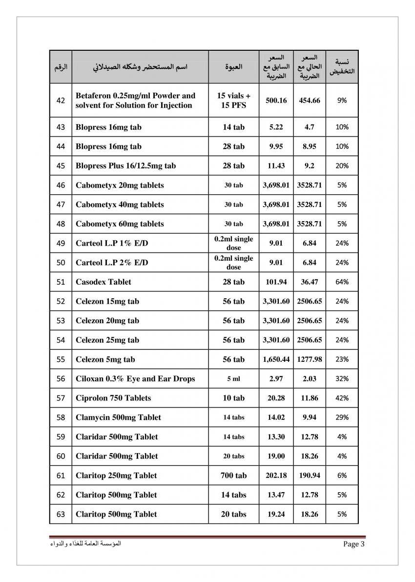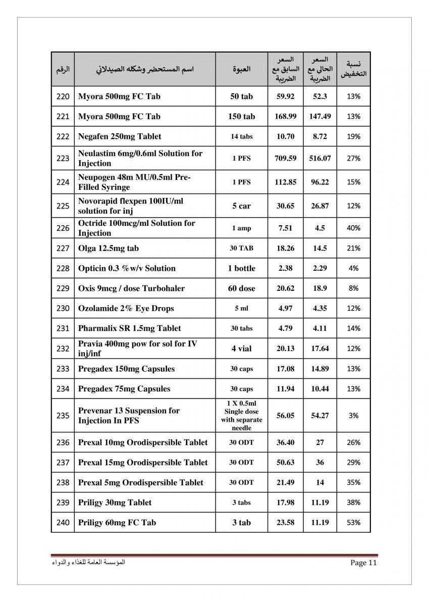 وكان مدير عام المؤسسة الأستاذ الدكتور نزار محمود مهيدات قد أعلن مؤخرا عن قرار تخفيض سعر عدة أصناف دوائية من الأدوية شائعة الاستخدام بنسب متفاوتة خلال النصف الأول من العام الحالي ، مشيرا إلى أن الأسعار الجديدة بوشر تطبيقها حاليا على بعض الأدوية على رفوف الصيدليات وسيطبق خلال الأشهر القادمة عند استيراد هذه الأدوية.