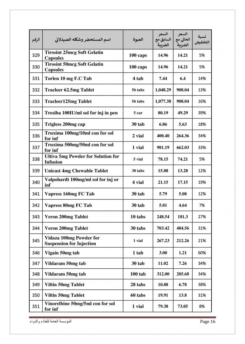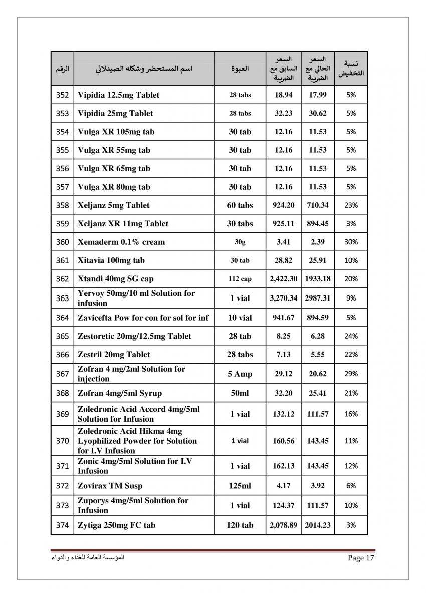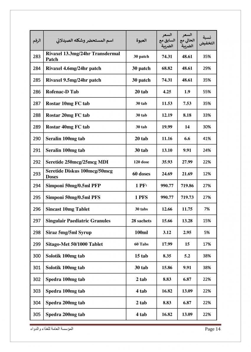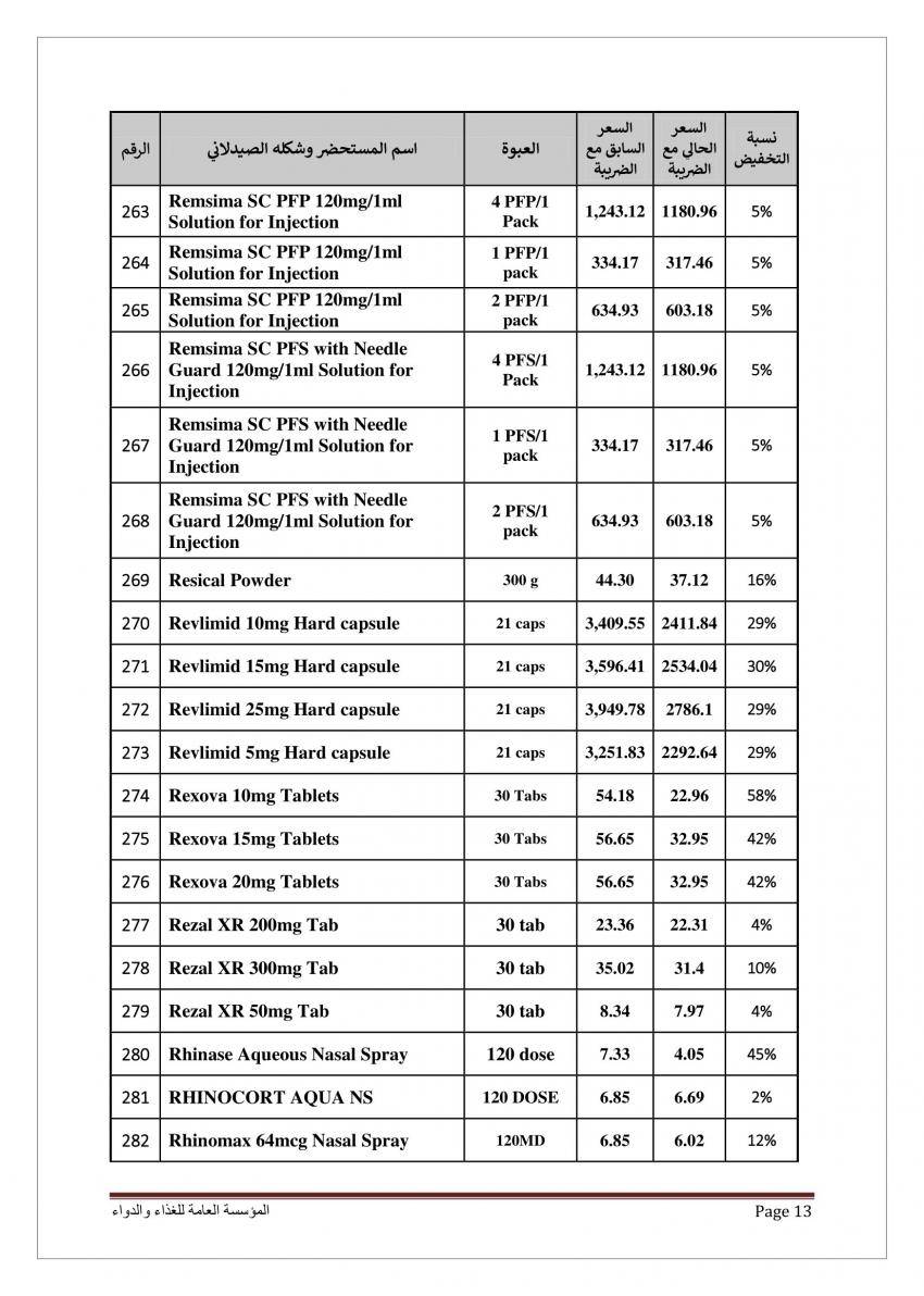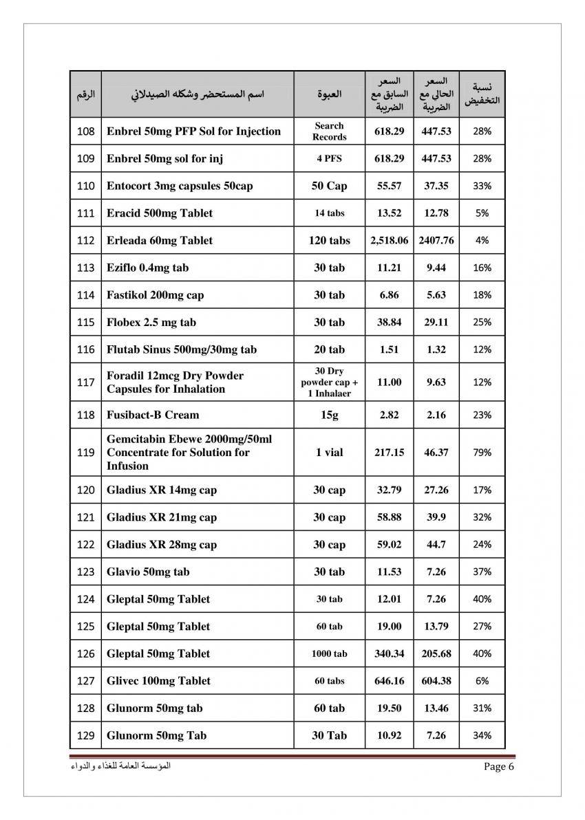 وكان مدير عام المؤسسة الأستاذ الدكتور نزار محمود مهيدات قد أعلن مؤخرا عن قرار تخفيض سعر عدة أصناف دوائية من الأدوية شائعة الاستخدام بنسب متفاوتة خلال النصف الأول من العام الحالي ، مشيرا إلى أن الأسعار الجديدة بوشر تطبيقها حاليا على بعض الأدوية على رفوف الصيدليات وسيطبق خلال الأشهر القادمة عند استيراد هذه الأدوية.