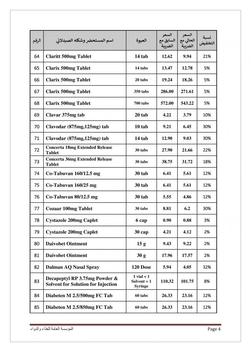وتتضمن القائمة الاسم التجاري للأدوية التي خضعت لتخفيض السعر وحجم العبوة والسعر السابق ما قبل التخفيض والسعر الحالي ما بعد التخفيض ونسبة التخفيض، ما يمكن المواطنين من الإطلاع على المعلومات المتعلقة بأسعار الأدوية.