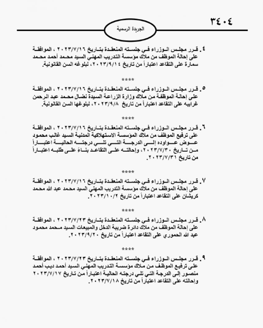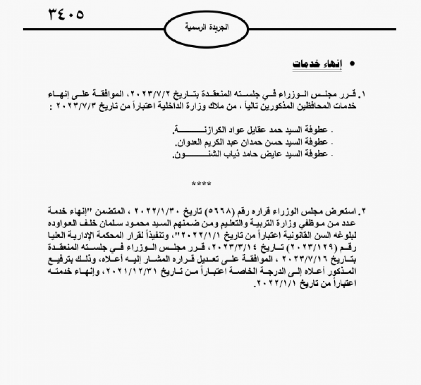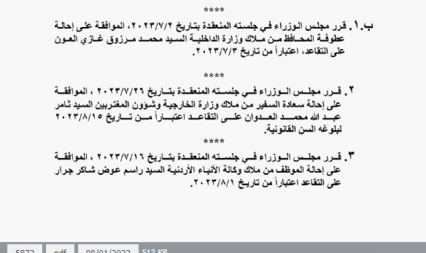 قرر مجلس الوزراء،اليوم الثلاثاء، بإحالة عدد من موظفي الدولة إلى التقاعد، وانهاء خدمات اخرين.