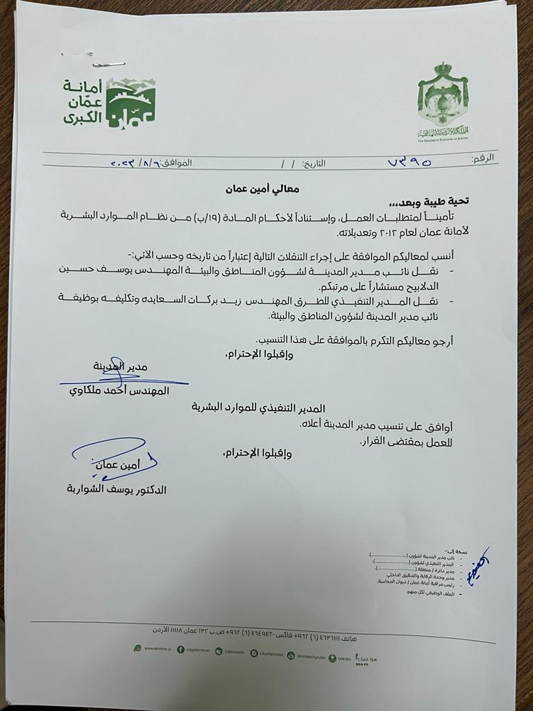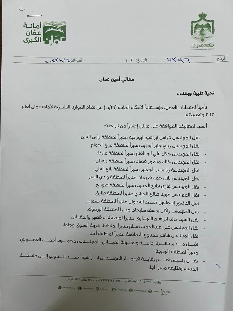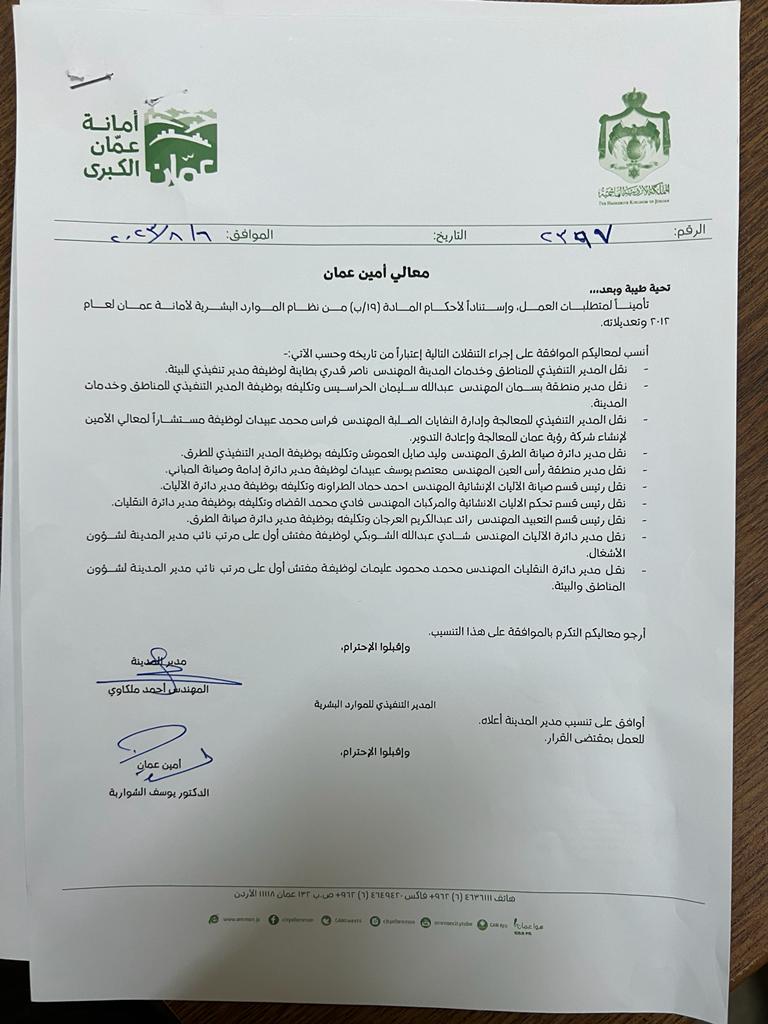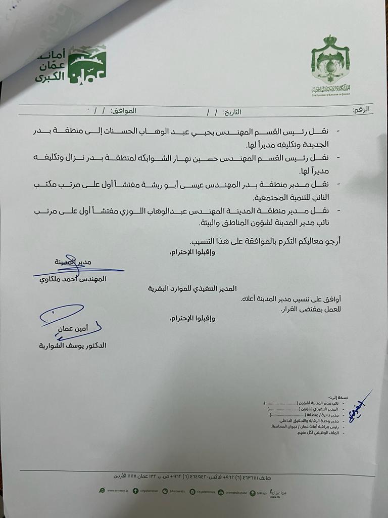 أجرى أمين عمان الدكتور يوسف الشواربة، تنقلات واسعة في الأمانة، شملت عشرات الموظفين.