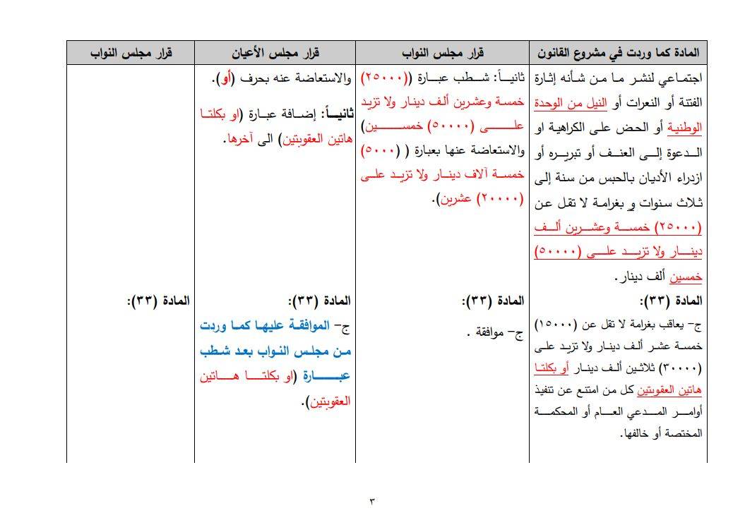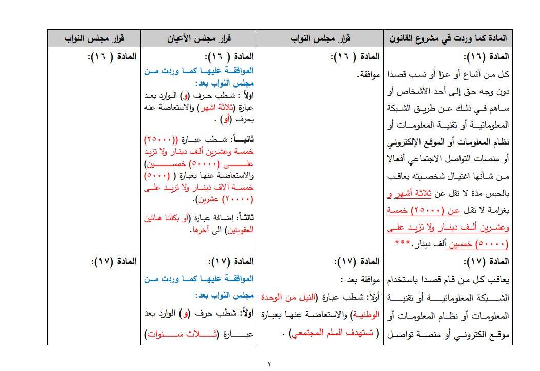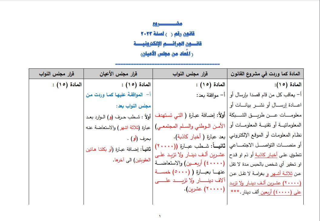 وأجرى مجلس الأعيان تعديلات على المواد 15 و16 و17 من مشروع قانون الجرائم الإلكترونية تضمنت شطب حرف "و" الوارد بعد عبارة "ثلاثة أشهر" والاستعاضة عنها بحرف "أو"، وإضافة عبارة أو بكلتا هاتين العقوبتين" لتصبح المادة 15: