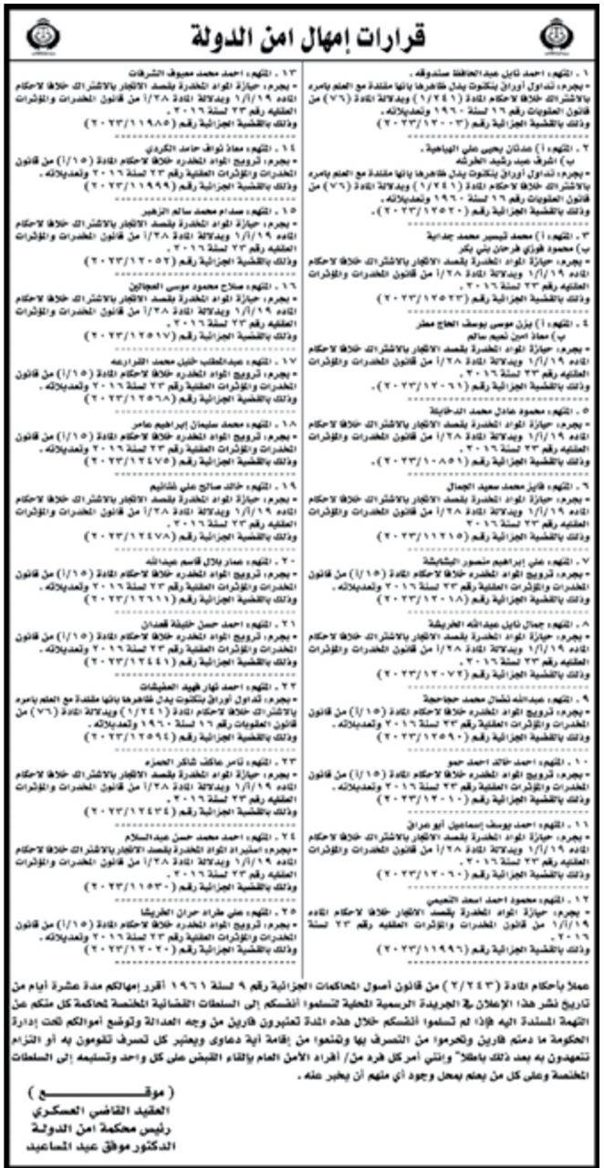 أعلنت محكمة أمن الدولة عن اعطاء مهلة لمتهمين مدة عشرة أيام من تاريخ اليوم الخميس، وذلك لتسليم أنفسهم إلى السلطات القضائية المختصة لمحاكمتهم عن التهم المسندة لكل منهم.