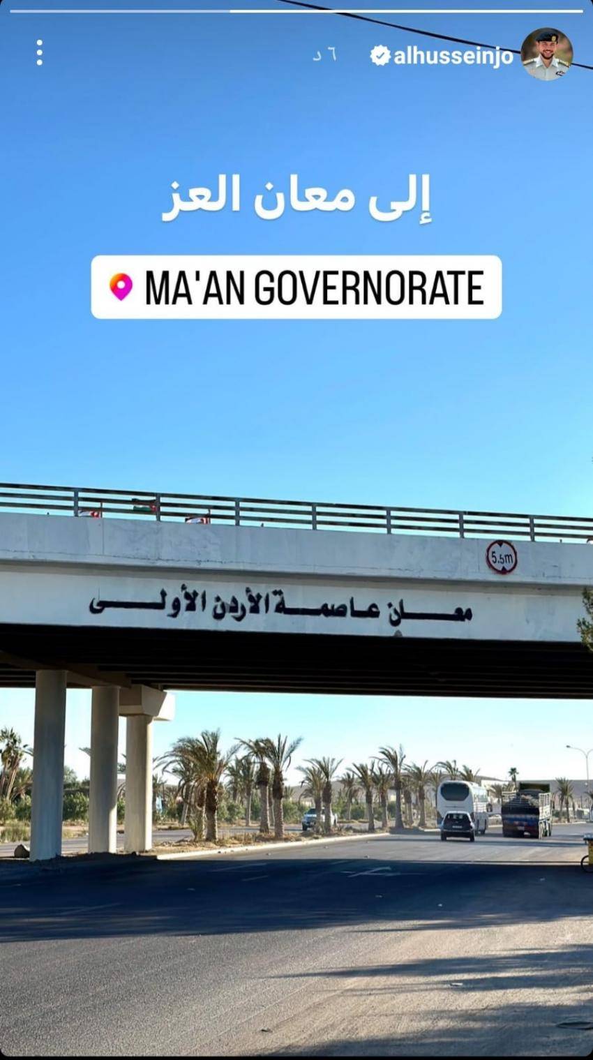 نشر سمو الامير الحسين بن عبد الله الثاني، ولي العهد، صورة عبر خاصية "الستوري" بصفحته على موقع التواصل الاجتماعي "انستقرام" يقول فيها إنه ذاهب إلى محافظة معان.