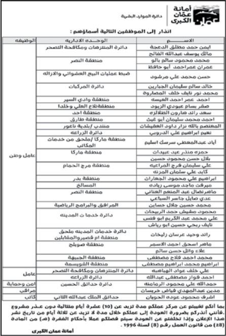 وجهت أمانة عمان الكبرى إنذارا لعدد من الموظفين المتغيبين عن العمل مدة تزيد على 10 أيام متتالية دون عذر مشروع، بضرورة العودة إلى عملهم خلال مدة لا تزيد على 3 أيام.