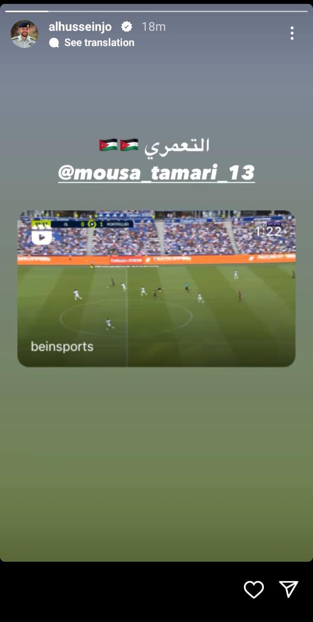 شارك ولي العهد سمو الأمير الحسين بن عبد الله الثاني، مساء السبت، مقطع فيديو عبر خاصية "الستوري" على حسابه الشخصي على موقع "إنستغرام" لأحد أهداف النجم الأردني موسى التعمري الذي يلعب في صفوف فريق مونبلييه الفرنسي.