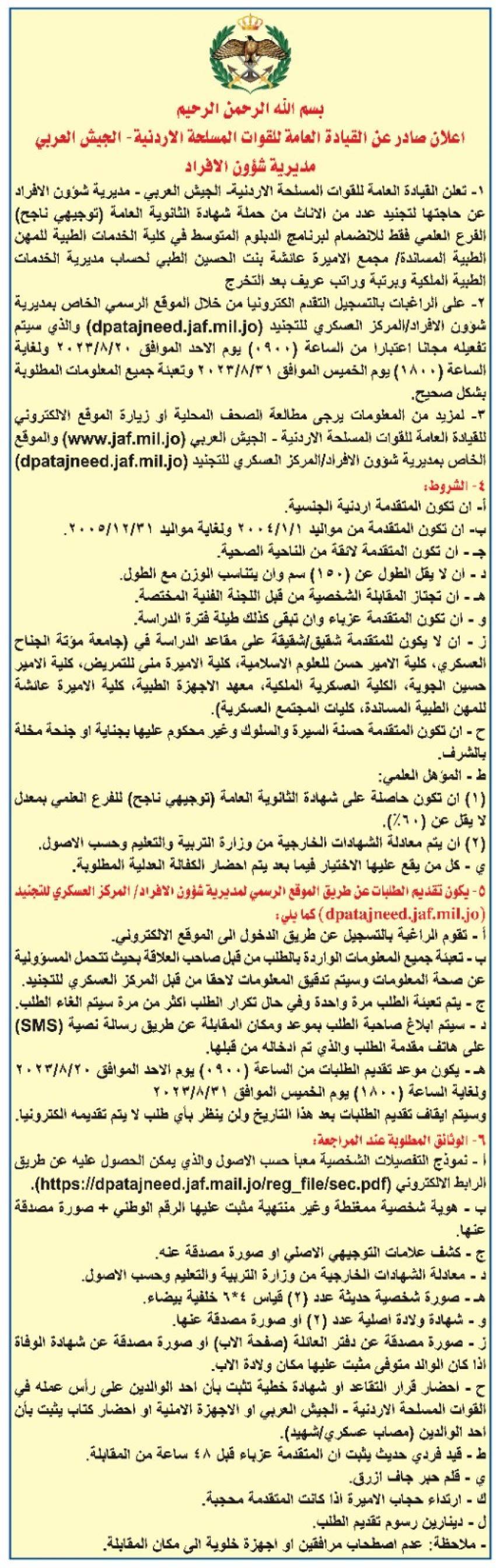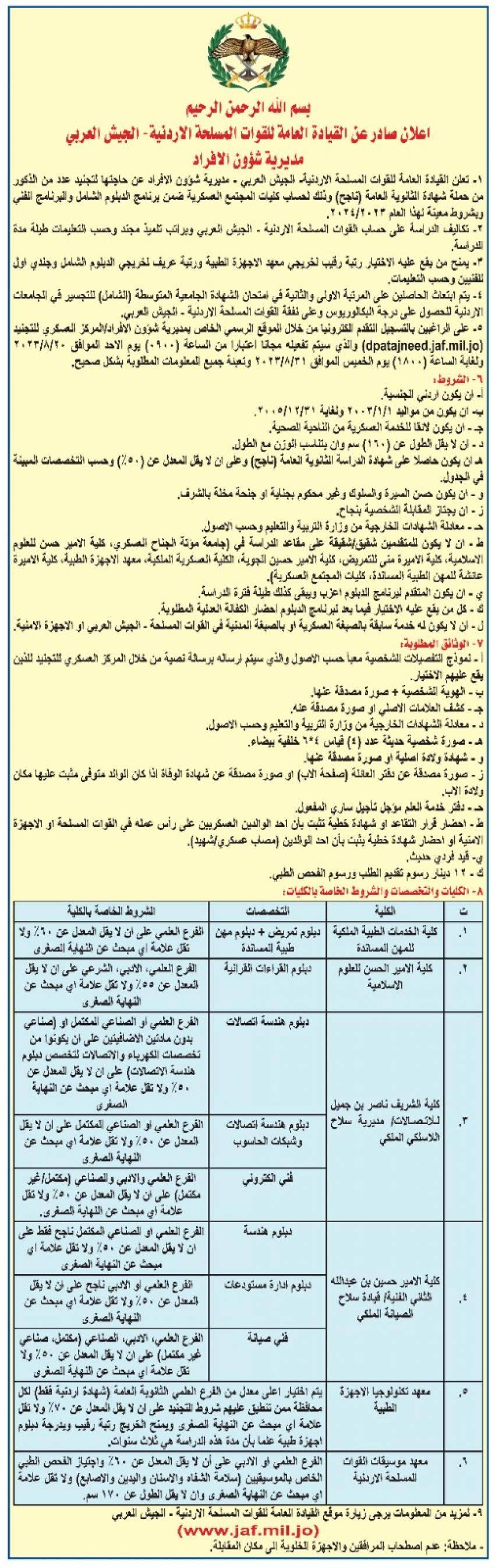 أعلنت القيادة العامة للقوات المسلحة الأردنية - الجيش العربي / مديرية شؤون الأفراد عن حاجتها لتجنيد عدد من الذكور والاناث من حملة شهادة الدراسة الثانوية العامة (ناجح) وذلك لحساب كليات المجتمع العسكرية ضمن برنامج الدبلوم الشامل والبرنامج الفني وبشروط معينة لهذا العام 2023/2024.