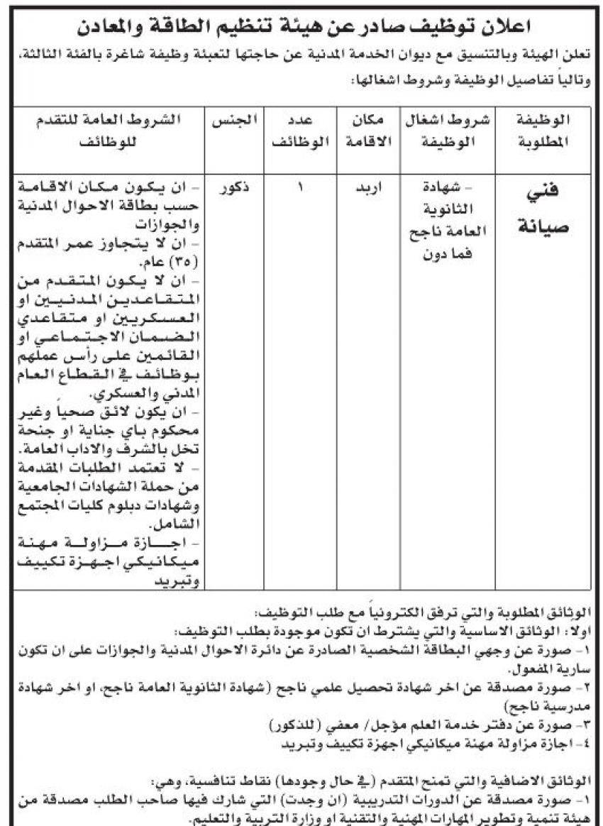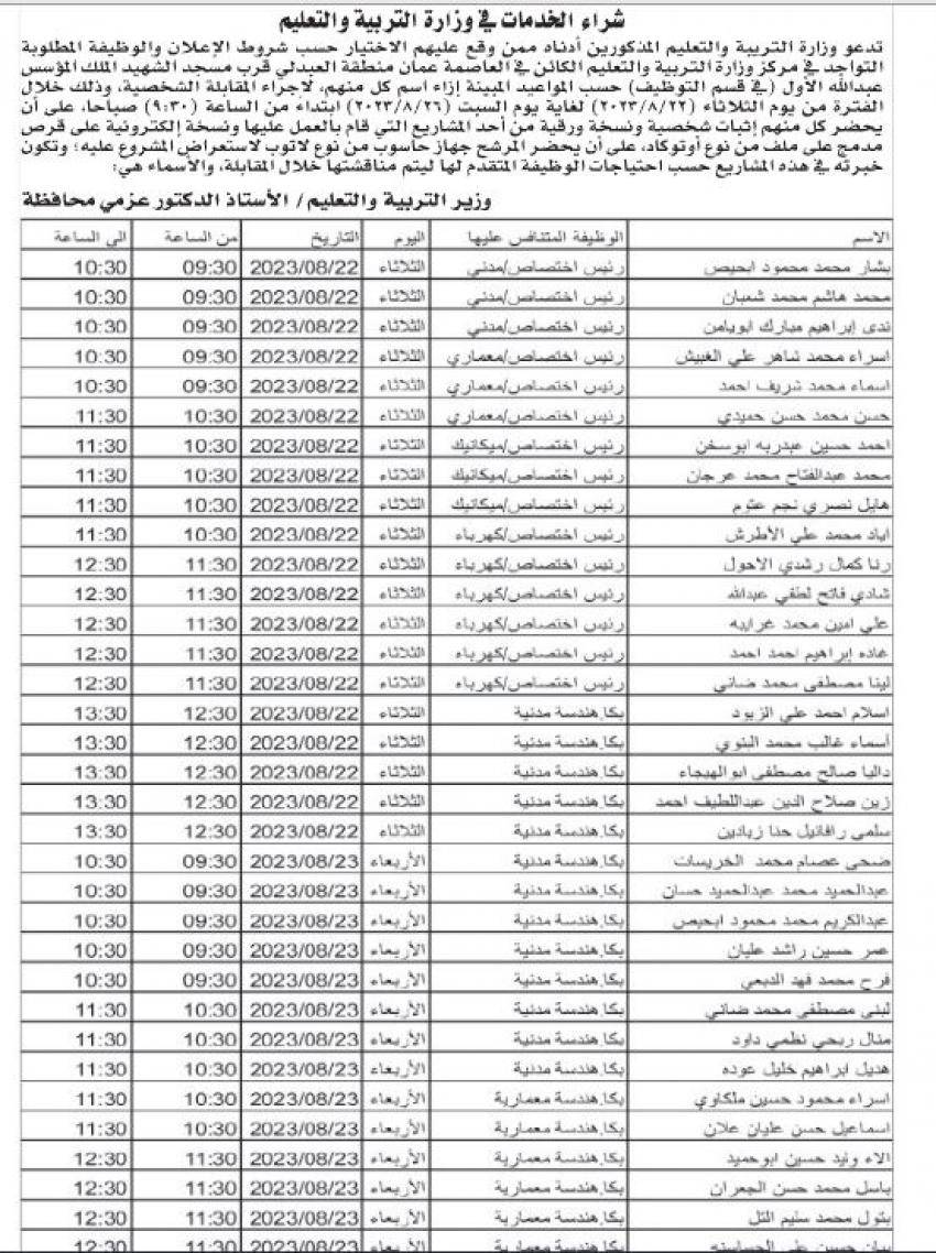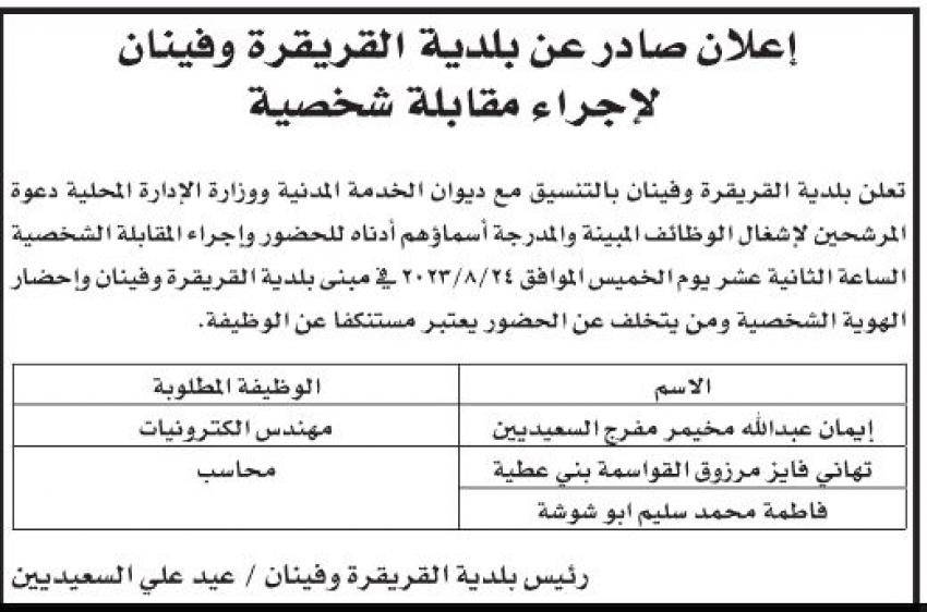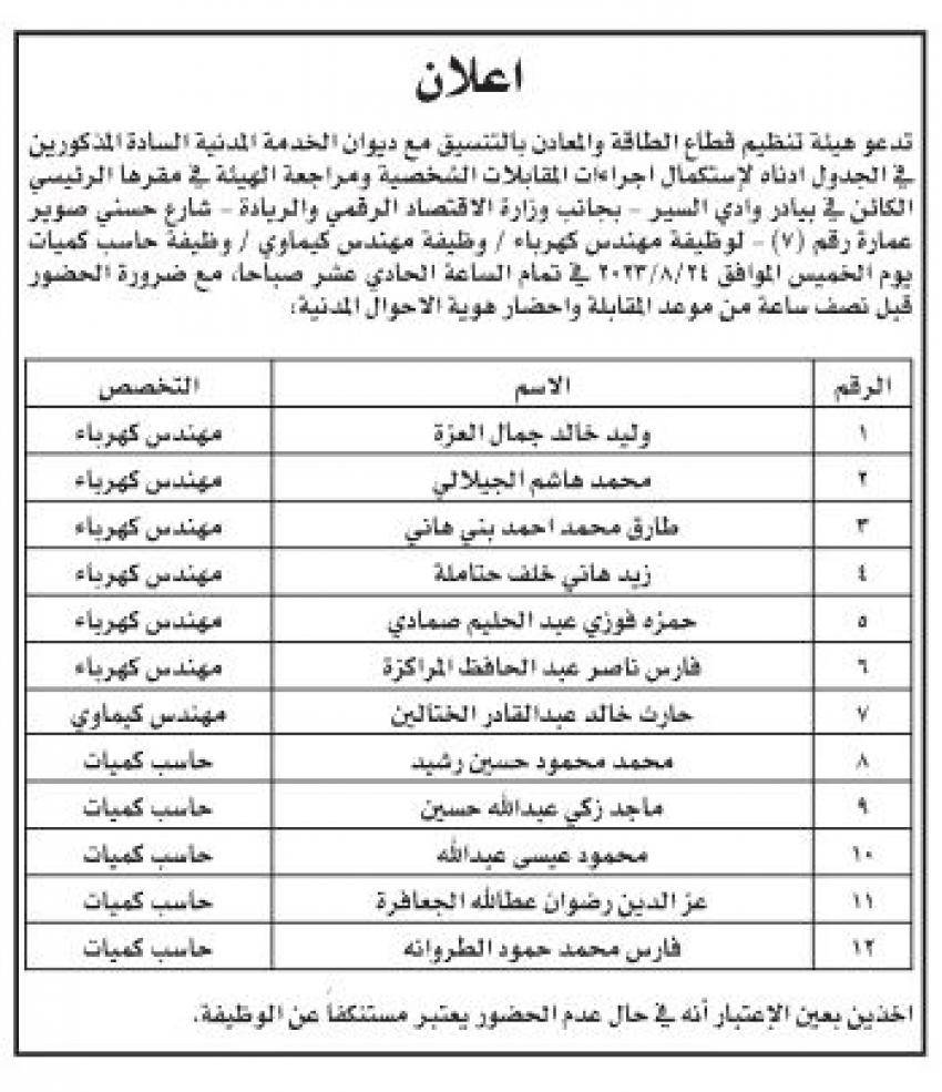 دعت عددا من الوزارات والمؤسسات الحكومية، اليوم الأحد، بالتنسيق مع ديوان الخدمة المدنية، مرشحين للتعيين لإشغال شواغر وظيفية لديها.
