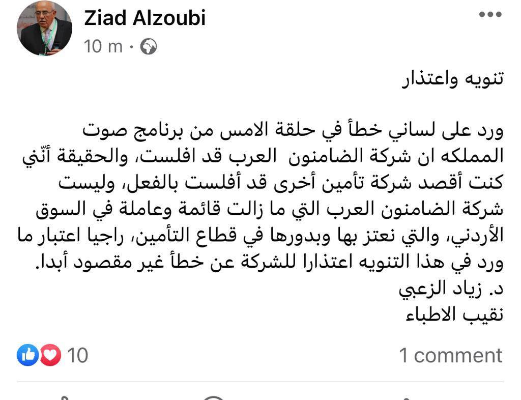 وجه نقيب الأطباء الأردنيين الدكتور زياد الزعبي اعتذاره لشركة الضامنون العرب، عن الخطأ الذي ورد على لسانه دون قصد.