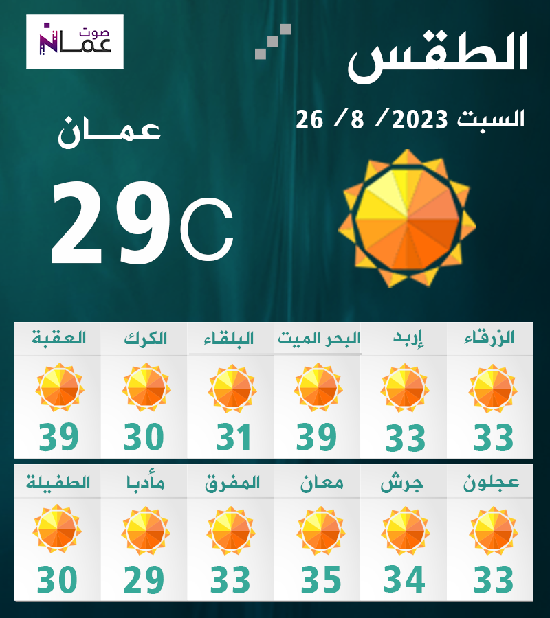 تبقى الأجواء يوم السبت صيفية عادية في أغلب المناطق، وحارة في مناطق البادية والأغوار والبحر الميت والعقبة، مع ظهور بعض الغيوم على ارتفاعات منخفضة في شمال الأردن، وتكون الرياح شمالية غربية معتدلة السرعة تنشط على فترات.
