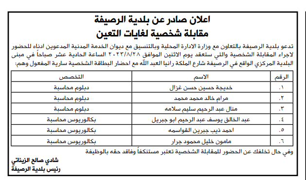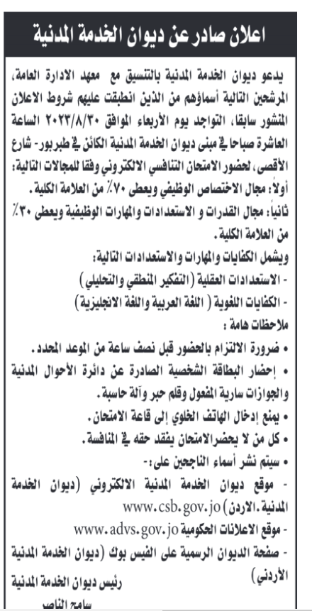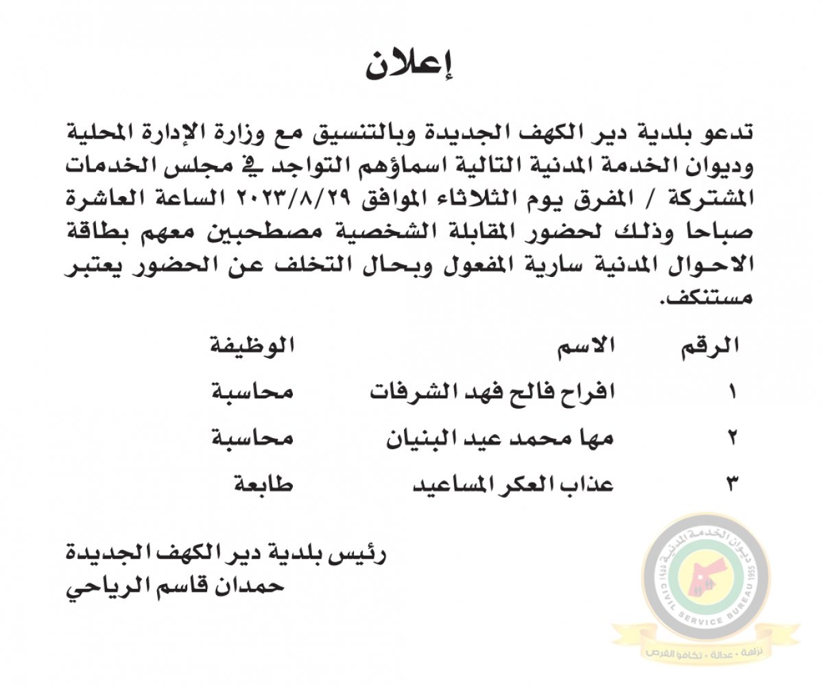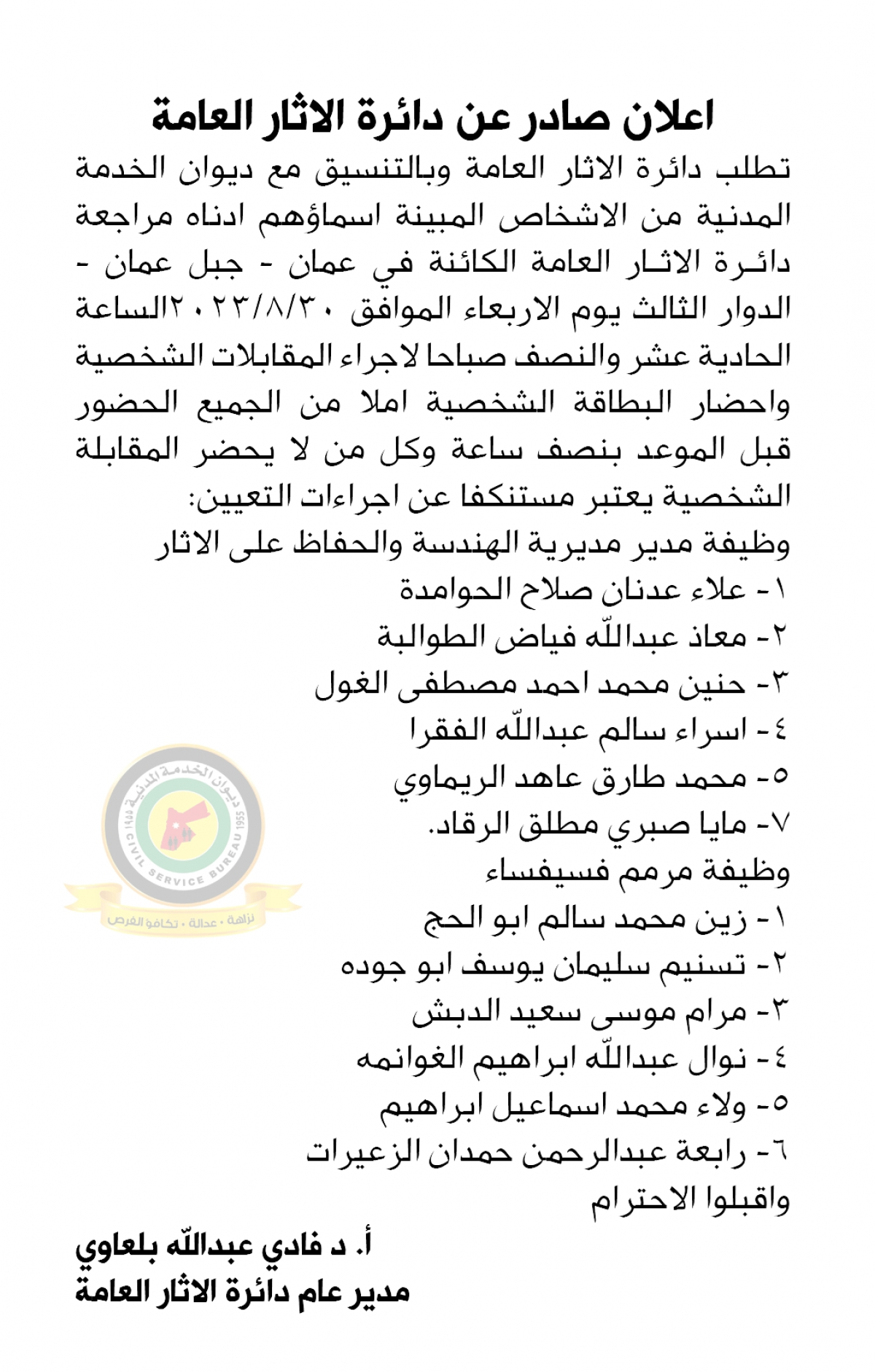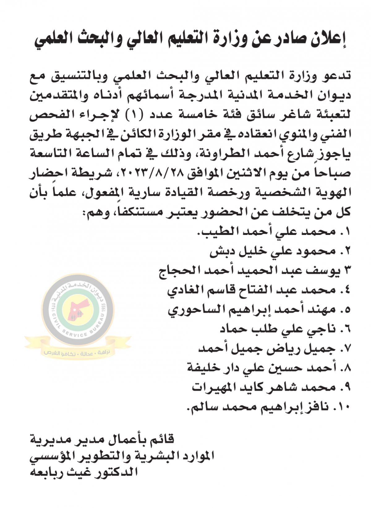 وجه ديوان الخدمة المدنية وبالتنسيق مع عدد من الوزارات والمؤسسات الحكومية، دعوة للأشخاص التالية لإجراء الاختبار التنافسي.