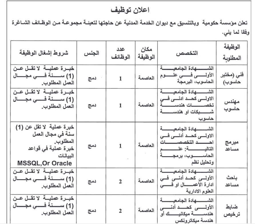 كما أعلن عن وظائف شاغرة بالتنسيق مع الوزارات والمؤسسات الحكومية .