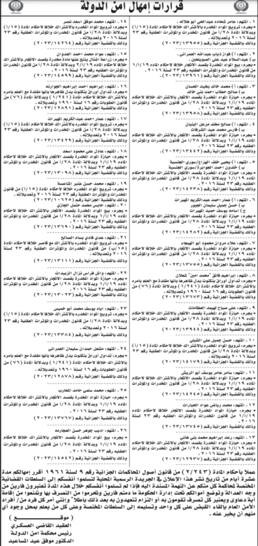وأمر القاضي المساعيد كل فرد من أفراد الأمن العام بإلقاء القبض على كل واحد وتسليمه إلى السلطات المختصة، وعلى كل من يعلم بمحل وجود أي منهم أن يخبر عنه".