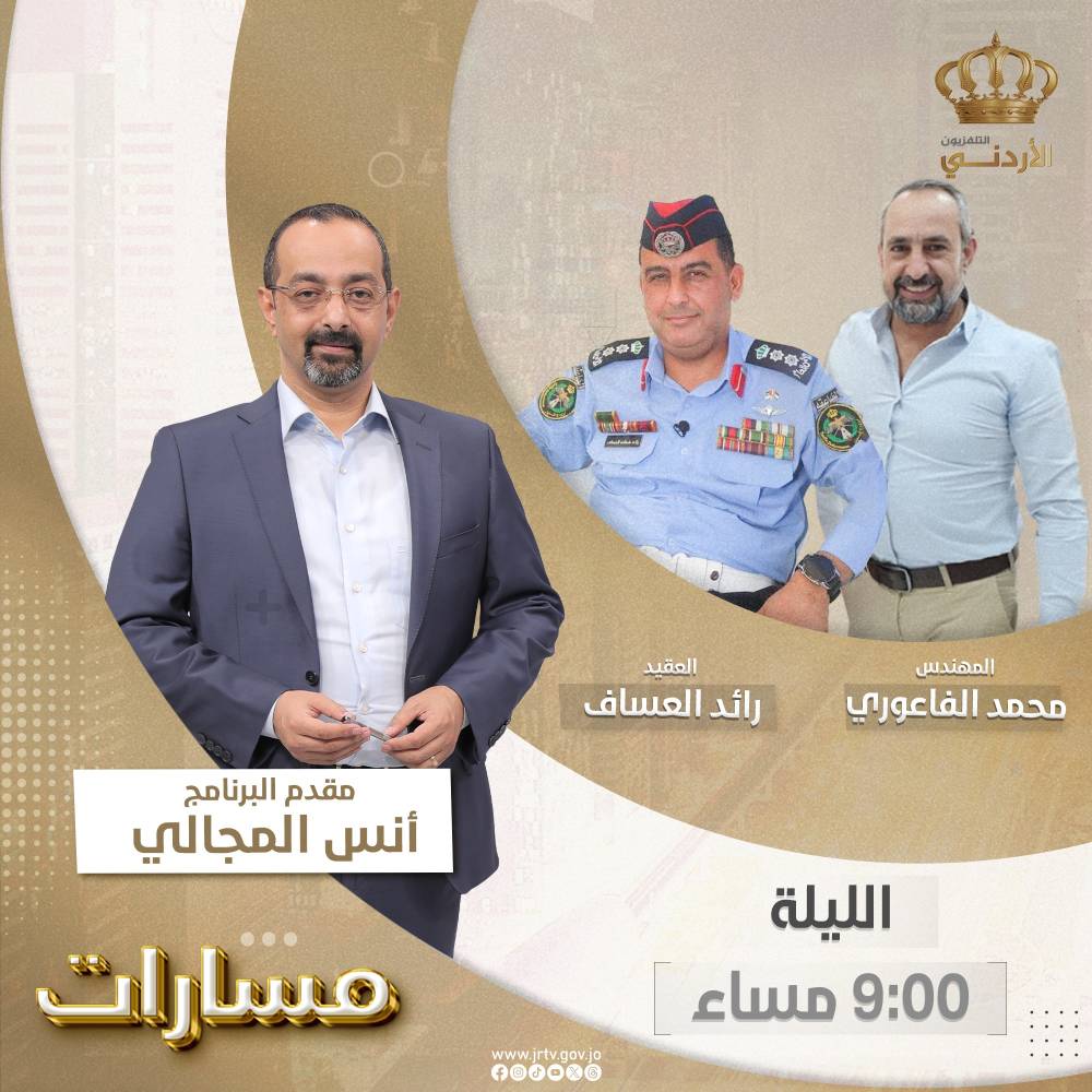 يستضيف برنامج "مسارات" الذي يبث عبر شاشة التلفزيون الأردني ويقدمه الزميل أنس المجالي، كل من مدير المعهد المروري العقيد رائد العساف، والمدير التنفيذي لعمليات المرور في أمانة عمان المهندس محمد الفاعوري.