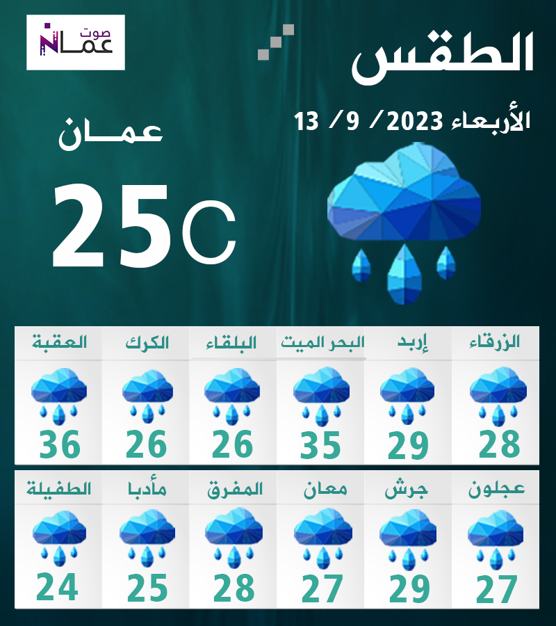 تبقى المملكة اليوم الأربعاء، تحت تأثير حالة ضعيفة من عدم الاستقرار الجوي، حيث يطرأ انخفاض قليل في درجات الحرارة، وتسود أجواء معتدلة فوق المرتفعات الجبلية والسهول، وحارة نسبياً إلى حارة في الأغوار والبحر الميت والعقبة.