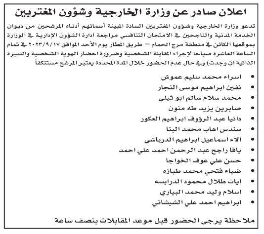 دعت وزارة الخارجية وشؤون المغتربين بالتنسيق مع ديوان الخدمة المدنية، اليوم الأربعاء مجموعة من المرشحين لإجراء المقابلات الشخصية.